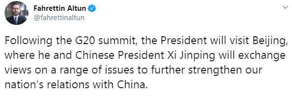 G20 Zirvesinden sonra Pekin’e bir ziyaret gerçekleştirecek olan Cumhurbaşkanımız, Çin Devlet Başkanı Şi Cinping ile Türkiye-Çin ilişkilerini daha da ileri taşıyacak konuları masaya yatıracak."