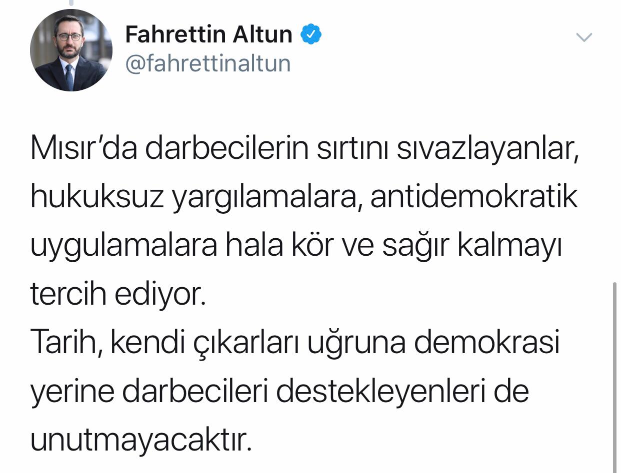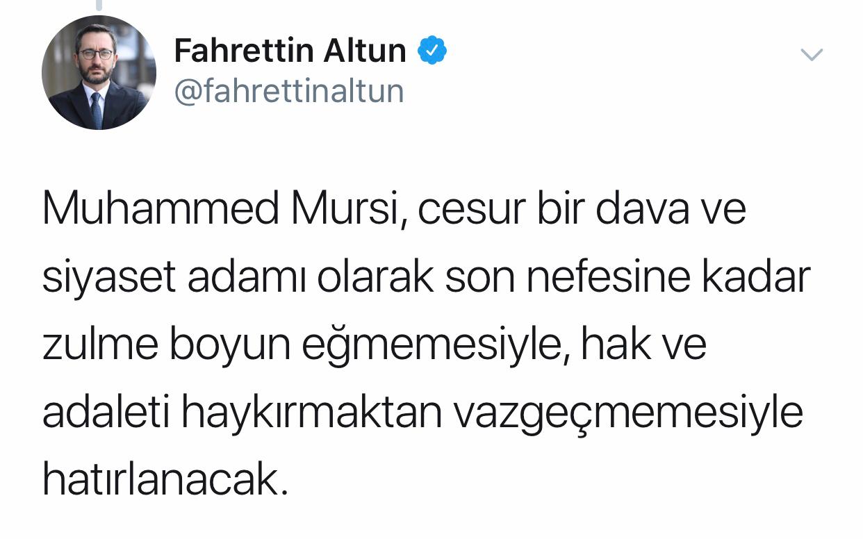 Cumhurbaşkanlığı İletişim Başkanı Prof. Dr. Fahrettin Altun, Mısır'ın demokratik yöntemlerle seçilmiş ilk Cumhurbaşkanı Muhammed Mursi'nin mahkeme salonunda hayatını kaybetmesi nedeniyle başsağlığı diledi.