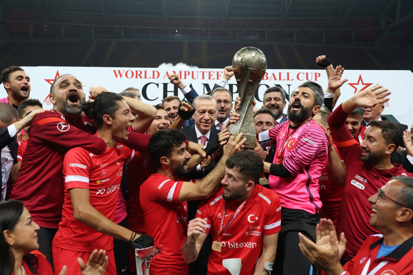 Cumhurbaşkanı Recep Tayyip Erdoğan, İstanbul'da düzenlenen 2022 Ampute Futbol Dünya Kupası'nda şampiyon olan Ampute Futbol Millî Takımı'na kupasını verdi.