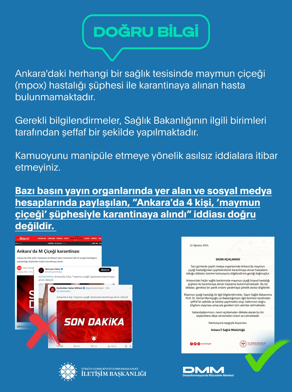 Son günlerde bazı basın yayın organlarında ve sosyal medya hesaplarında yer alan “Ankara'da 4, İstanbul'da 1 kişi maymun çiçeği şüphesiyle karantinaya alındı” iddiaları gerçeği yansıtmamaktadır.