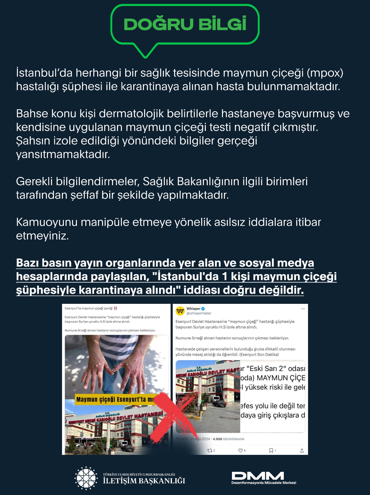 İstanbul'daki bahse konu kişi, dermatolojik belirtilerle hastaneye başvurmuş ve kendisine yapılan maymun çiçeği testi negatif çıkmıştır. Şahsın izole edildiği yönündeki bilgiler de doğru değildir.