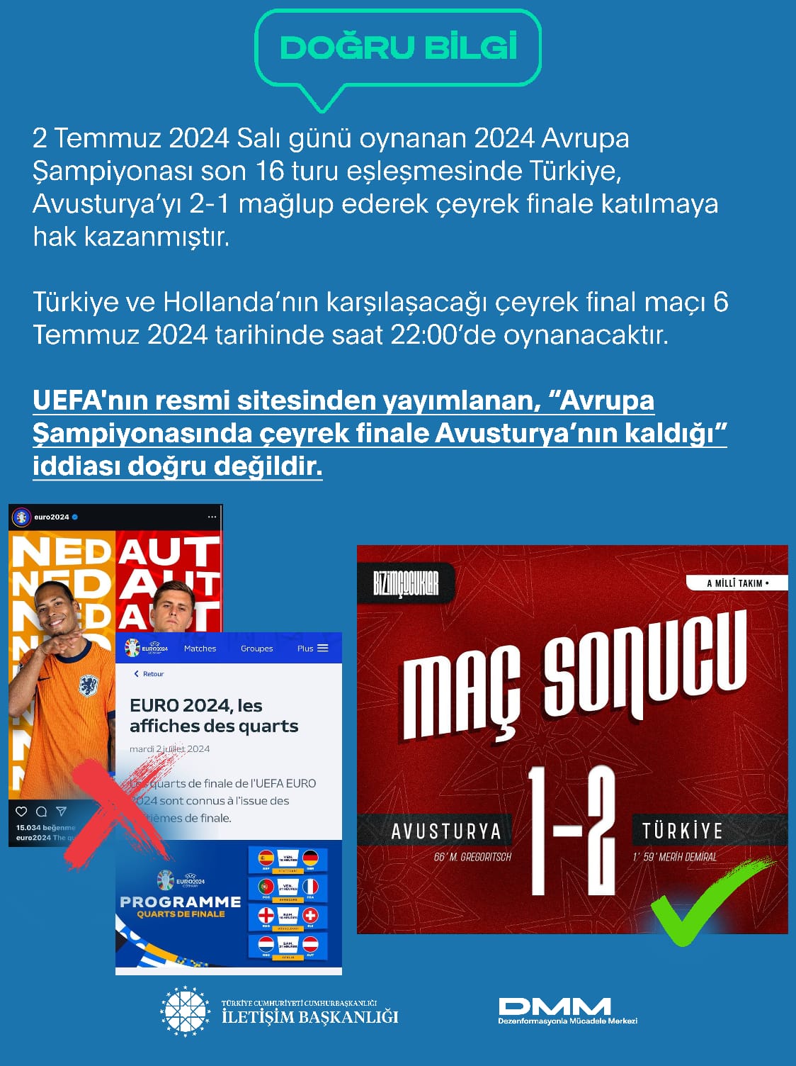 UEFA'nın resmî sitesinden yayımlanan, “Avrupa Şampiyonasında çeyrek finale Avusturya’nın kaldığı” iddiası doğru değildir.