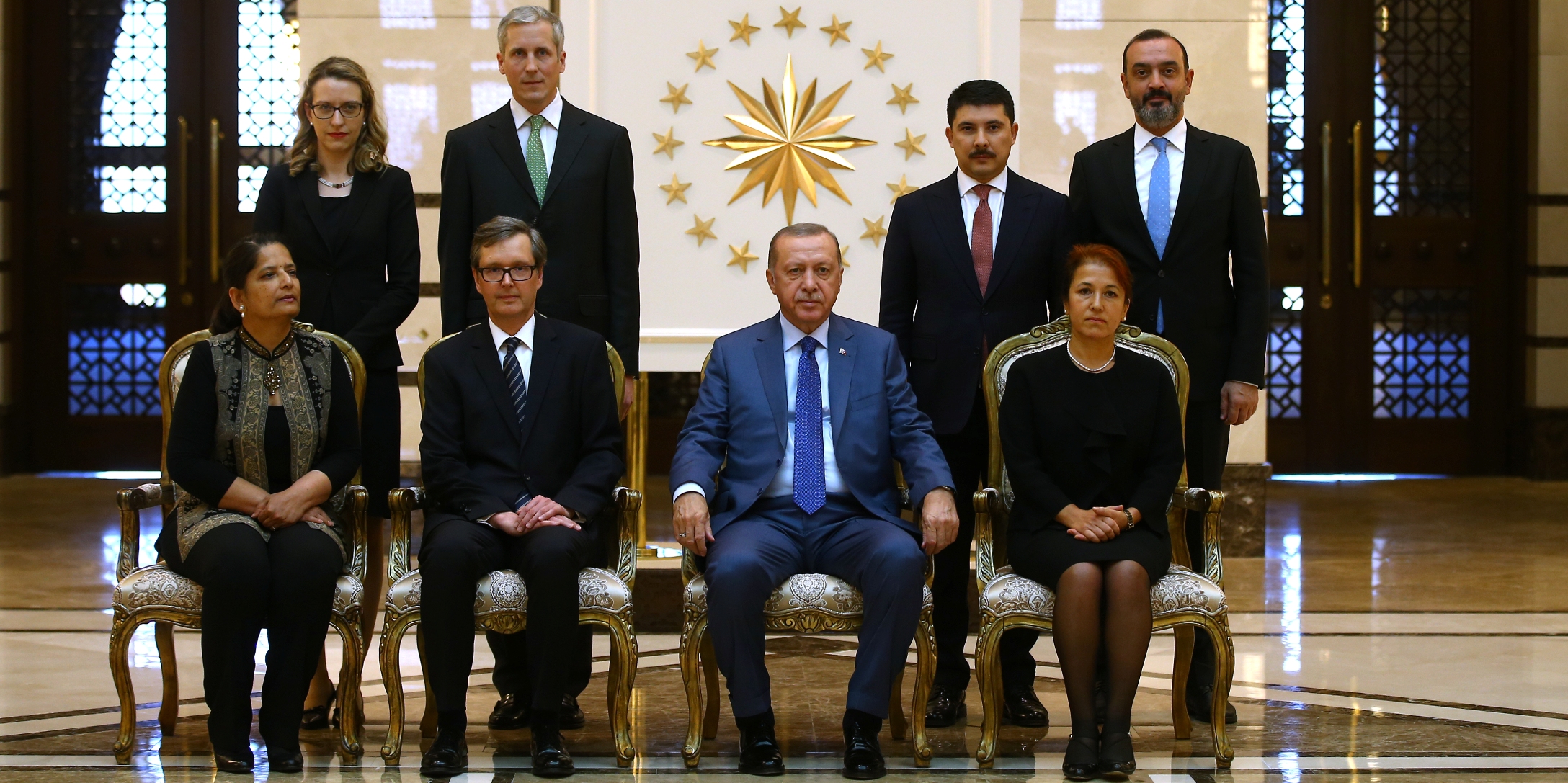 Büyükelçilerin aileleri ve bazı büyükelçilik mensuplarının Cumhurbaşkanı Erdoğan’a takdim edilmesinin ardından hatıra fotoğrafı çektirildi.