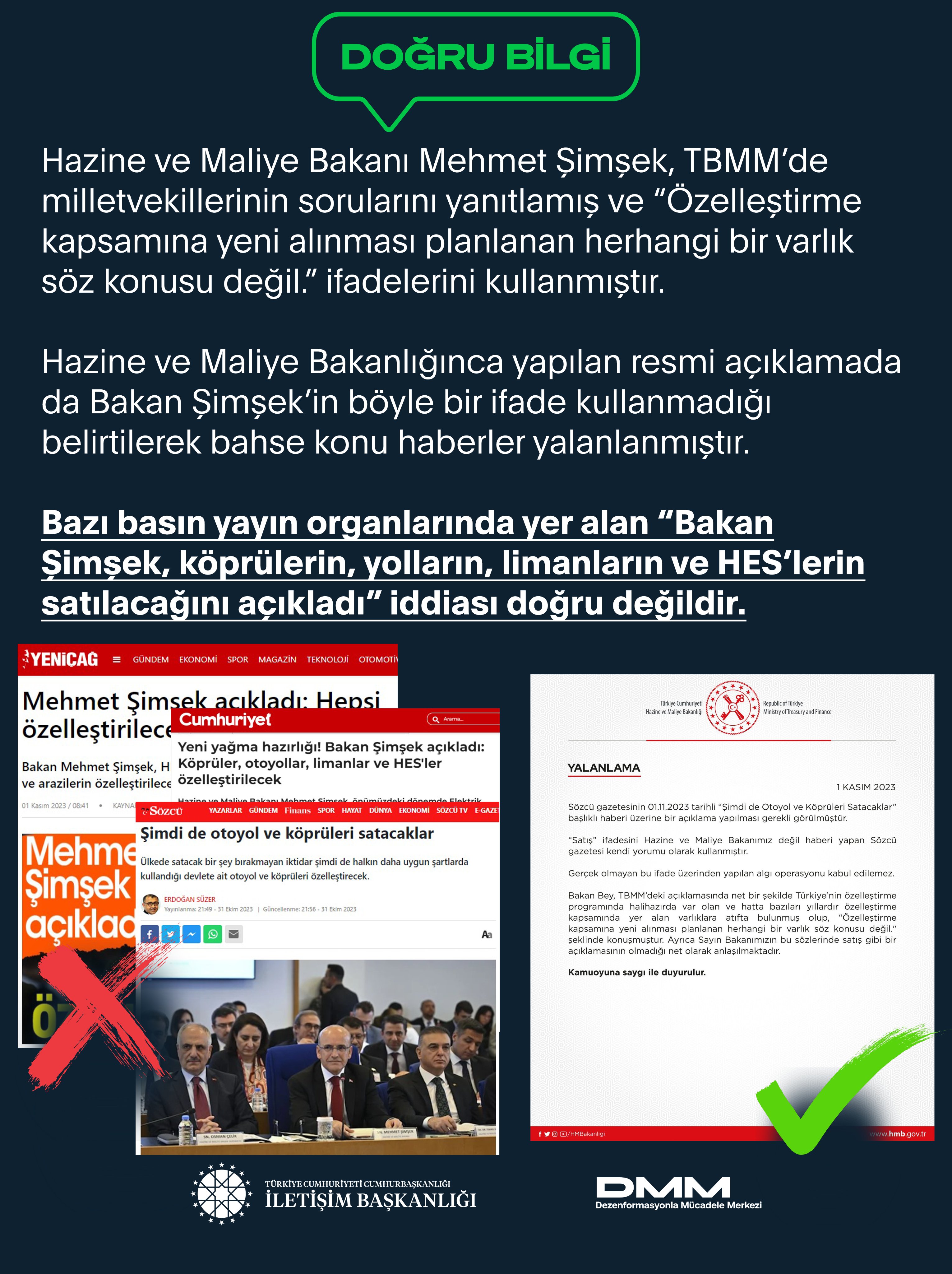 Bazı basın yayın organlarında yer alan “Bakan Şimşek, köprülerin, yolların, limanların ve HES’lerin satılacağını açıkladı” iddiası doğru değildir.