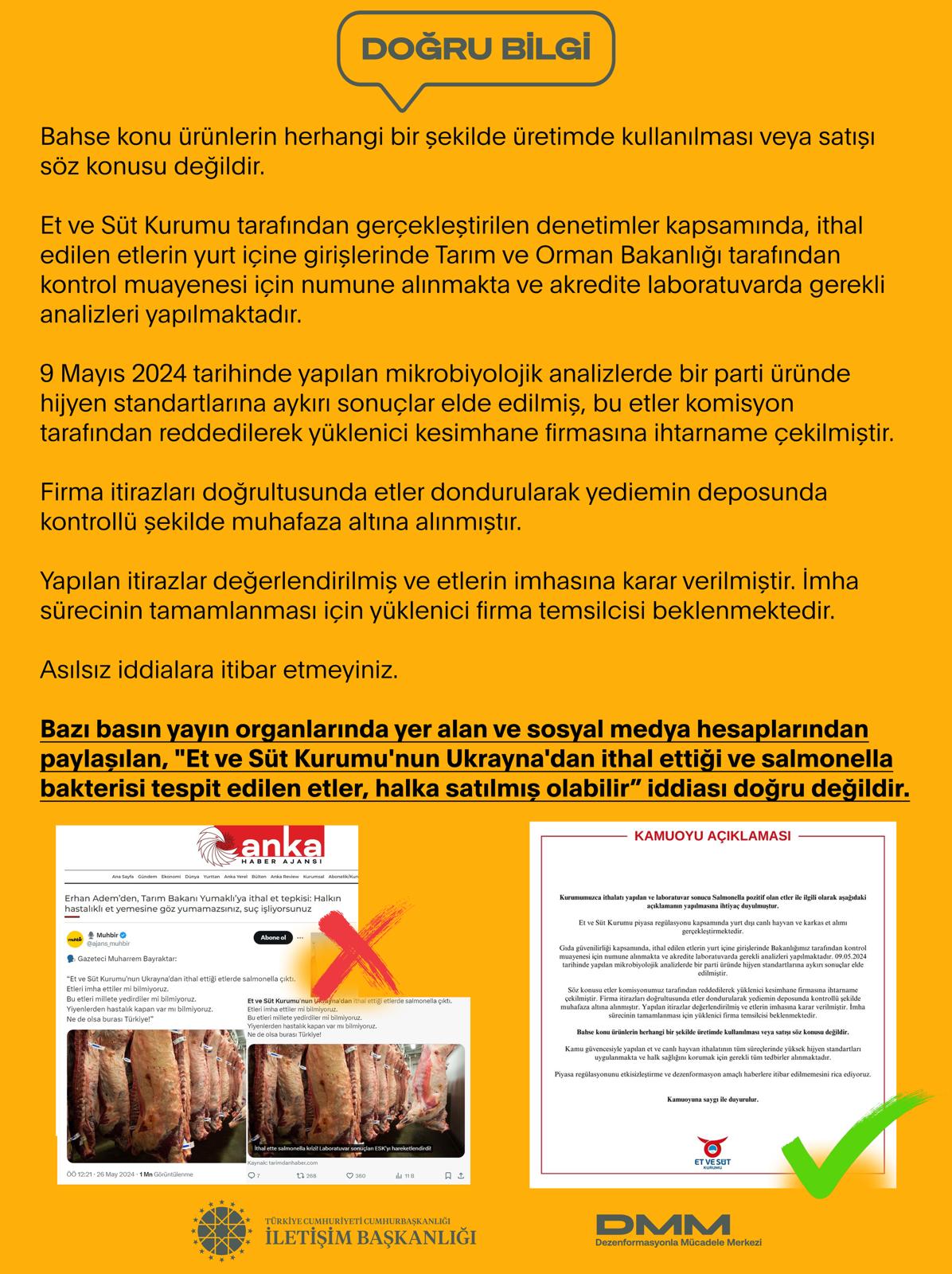 Bazı basın yayın organlarında yer alan ve sosyal medya hesaplarından paylaşılan, "Et ve Süt Kurumu'nun Ukrayna'dan ithal ettiği ve salmonella bakterisi tespit edilen etler, halka satılmış olabilir” iddiası doğru değildir.