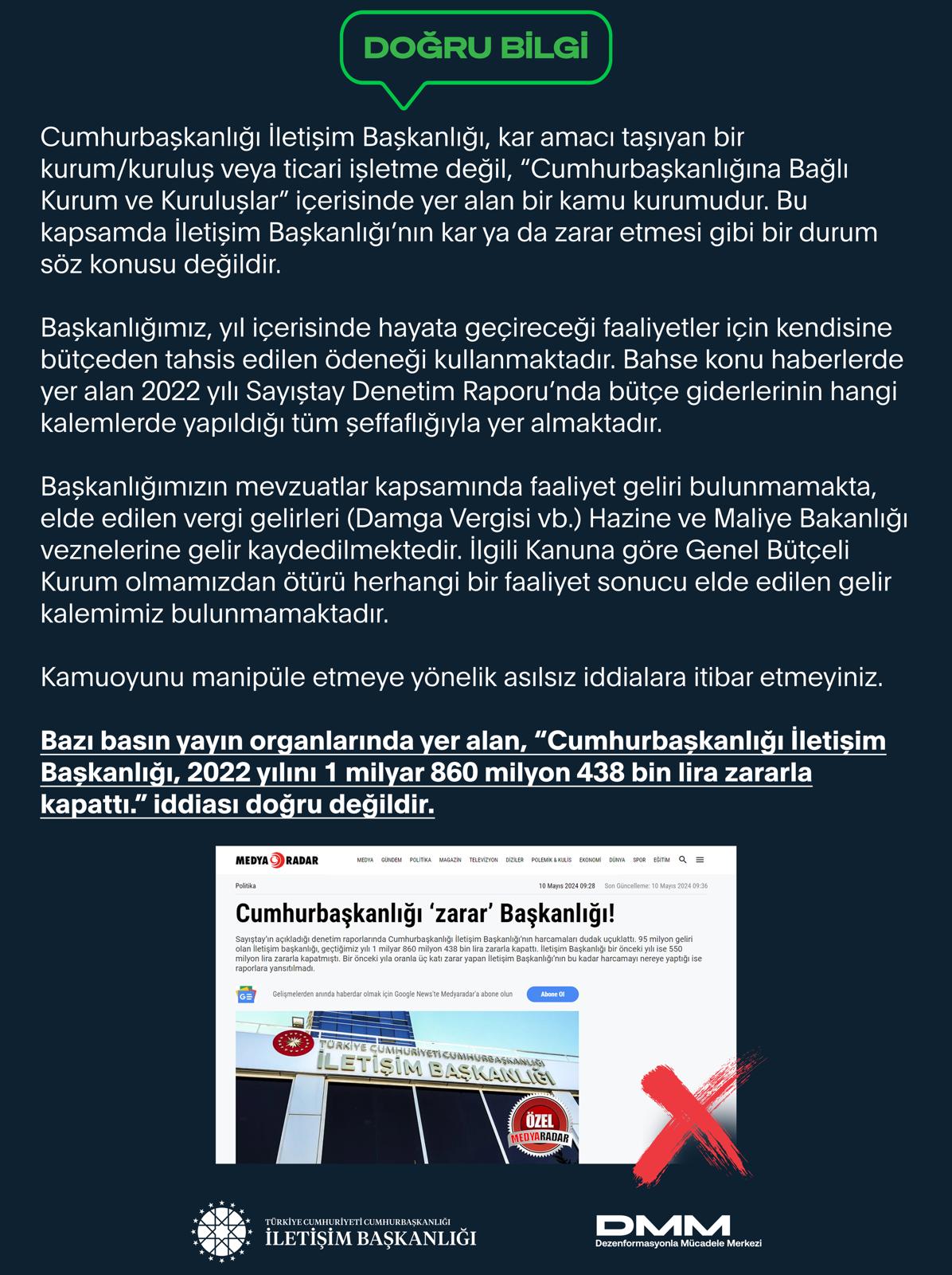 Bazı basın yayın organlarında yer alan, “Cumhurbaşkanlığı İletişim Başkanlığı, 2022 yılını 1 milyar 860 milyon 438 bin lira zararla kapattı.” iddiası doğru değildir.