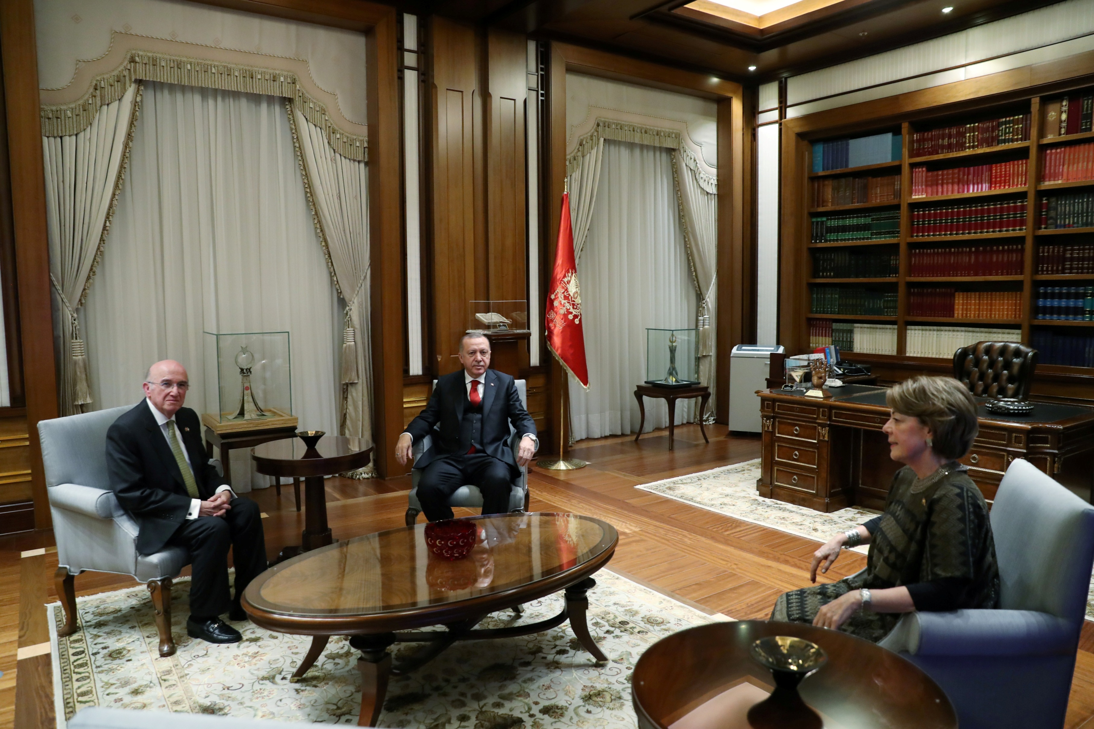 Cumhurbaşkanı Erdoğan, kabulde, Meksika Büyükelçisi Hernandez'in eşi ve aynı zamanda Sultan II. Abdülhamit'in kızı Ayşe Sultan'ın torunu olan Mediha Şükriye Nami Martinez Hernandez Osmanoğlu ile bir süre sohbet etti.
