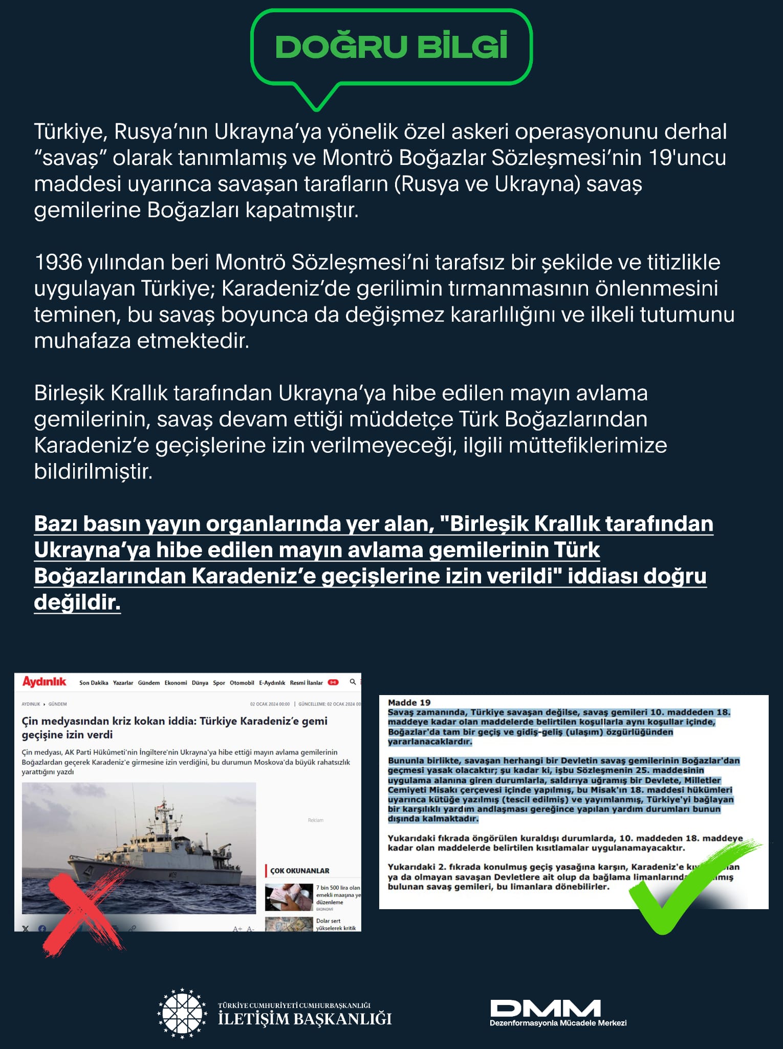 Bazı basın yayın organlarında yer alan, "Birleşik Krallık tarafından Ukrayna’ya hibe edilen mayın avlama gemilerinin Türk Boğazlarından Karadeniz’e geçişlerine izin verildi" iddiası doğru değildir.
