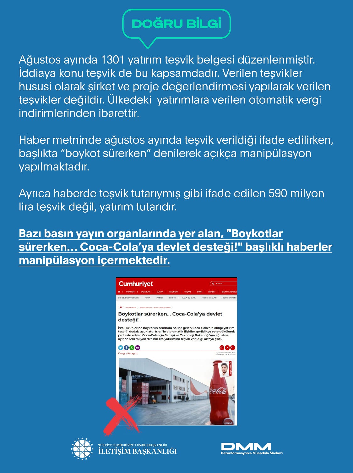 Bazı sosyal medya hesaplarından paylaşılan "Boykotlar sürerken… Coca-Cola’ya devlet desteği!" başlıklı haberler manipülasyon içermektedir.