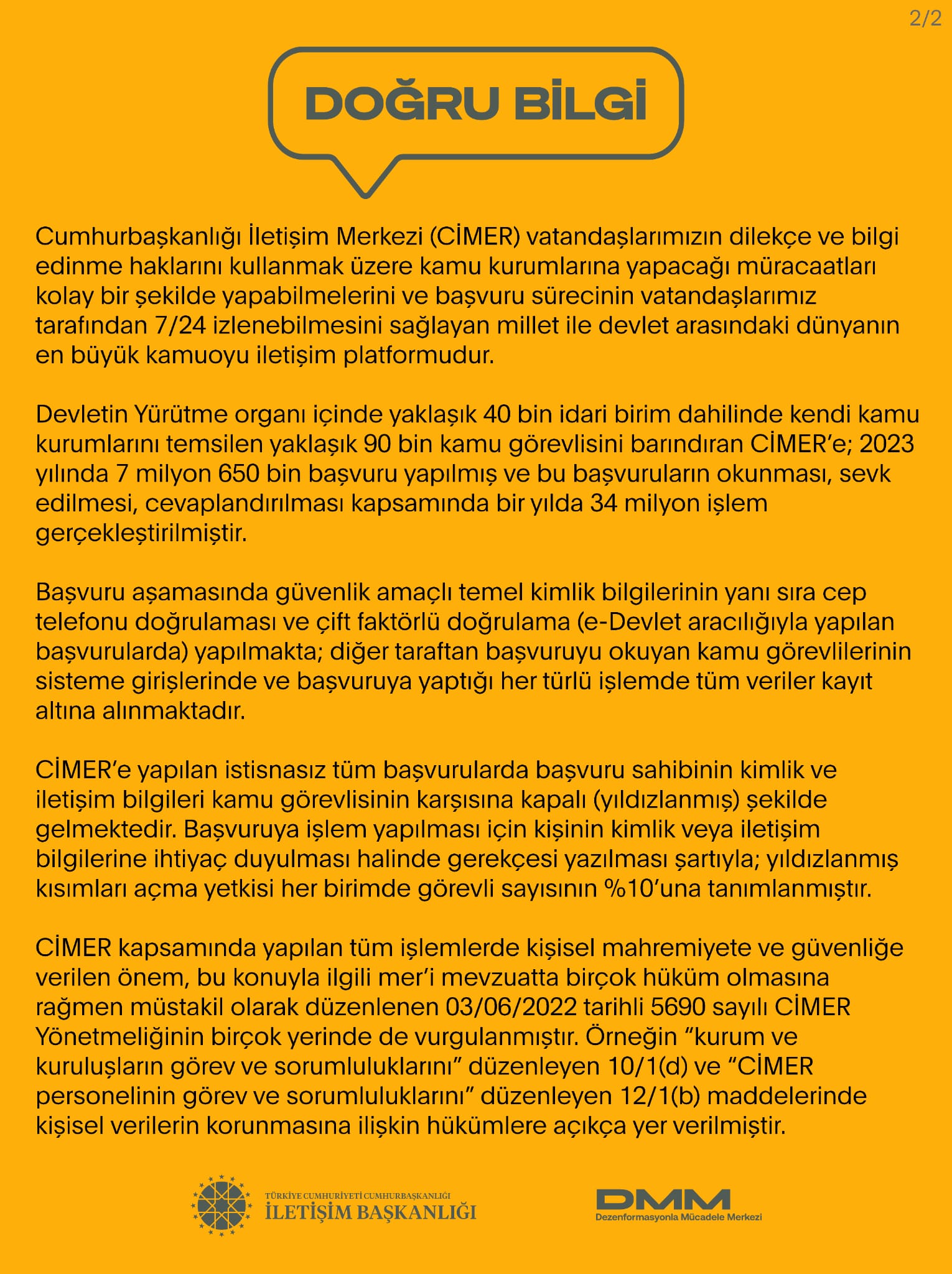 Devletin Yürütme organı içinde yaklaşık 40 bin idari birim dâhilinde kendi kamu kurumlarını temsilen yaklaşık 90 bin kamu görevlisini barındıran CİMER’e; 2023 yılında 7 milyon 650 bin başvuru yapılmış ve bu başvuruların okunması, sevk edilmesi, cevaplandırılması kapsamında bir yılda 34 milyon işlem gerçekleştirilmiştir.