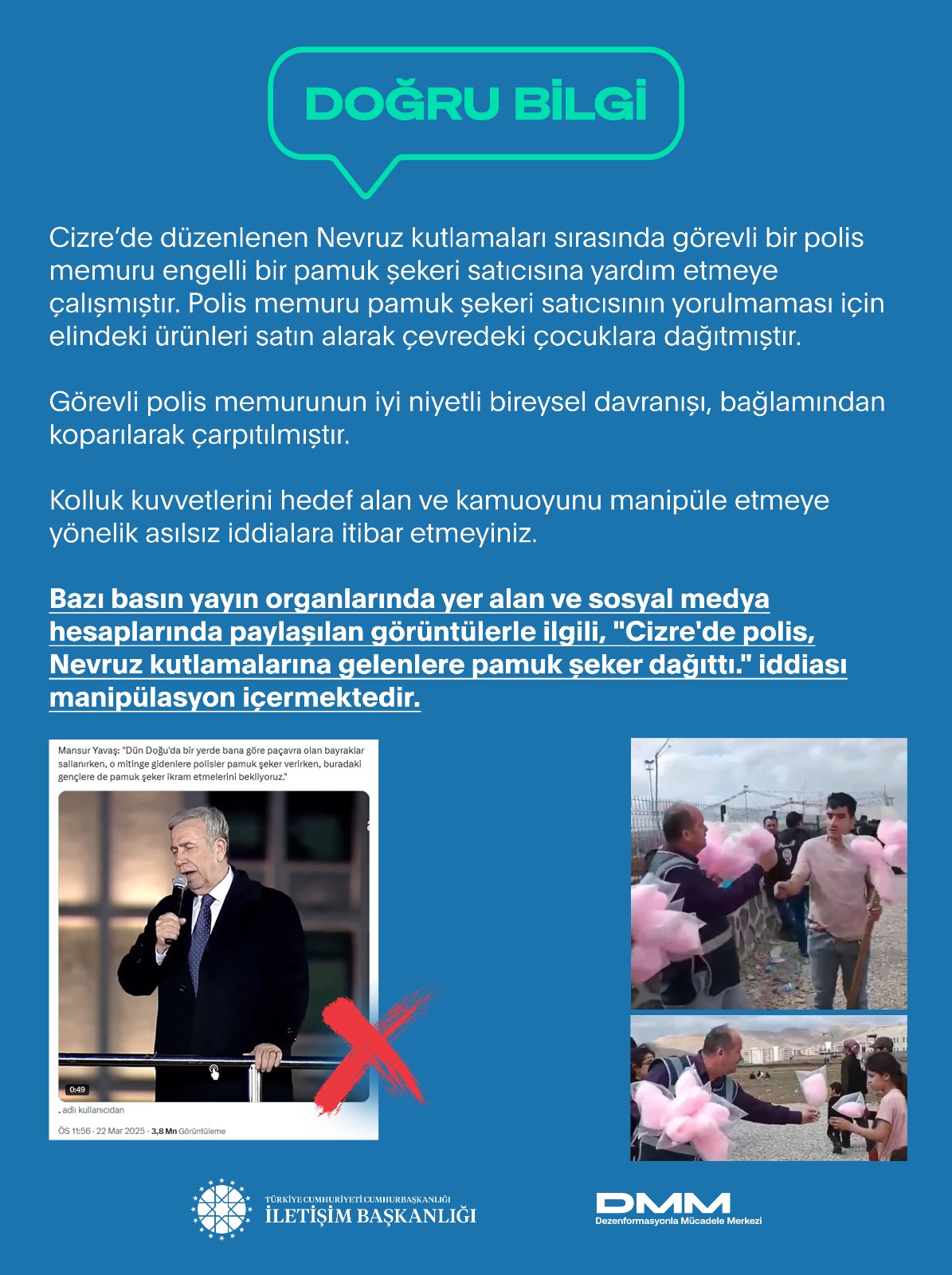 Bazı basın yayın organlarında yer alan ve sosyal medya hesaplarında paylaşılan görüntülerle ilgili, "Cizre'de polis, Nevruz kutlamalarına gelenlere pamuk şeker dağıttı." iddiası manipülasyon içermektedir.