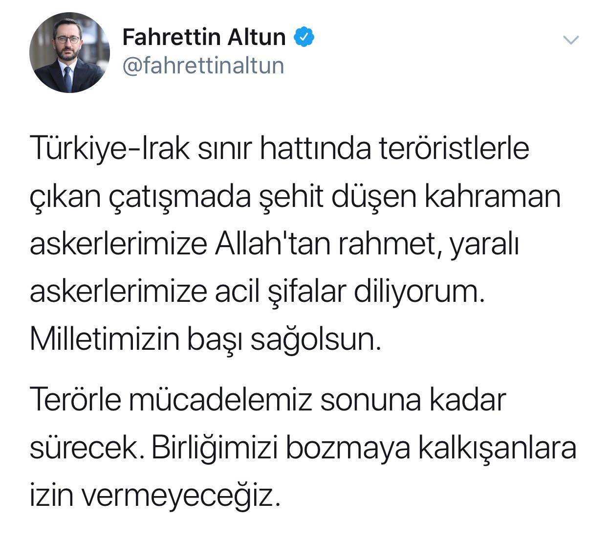 Cumhurbaşkanlığı İletişim Başkanı Prof. Dr. Fahrettin Altun, Irak sınırında şehit düşen ve yaralanan askerlerimizle ilgili Twitter hesabından paylaşımda bulundu.