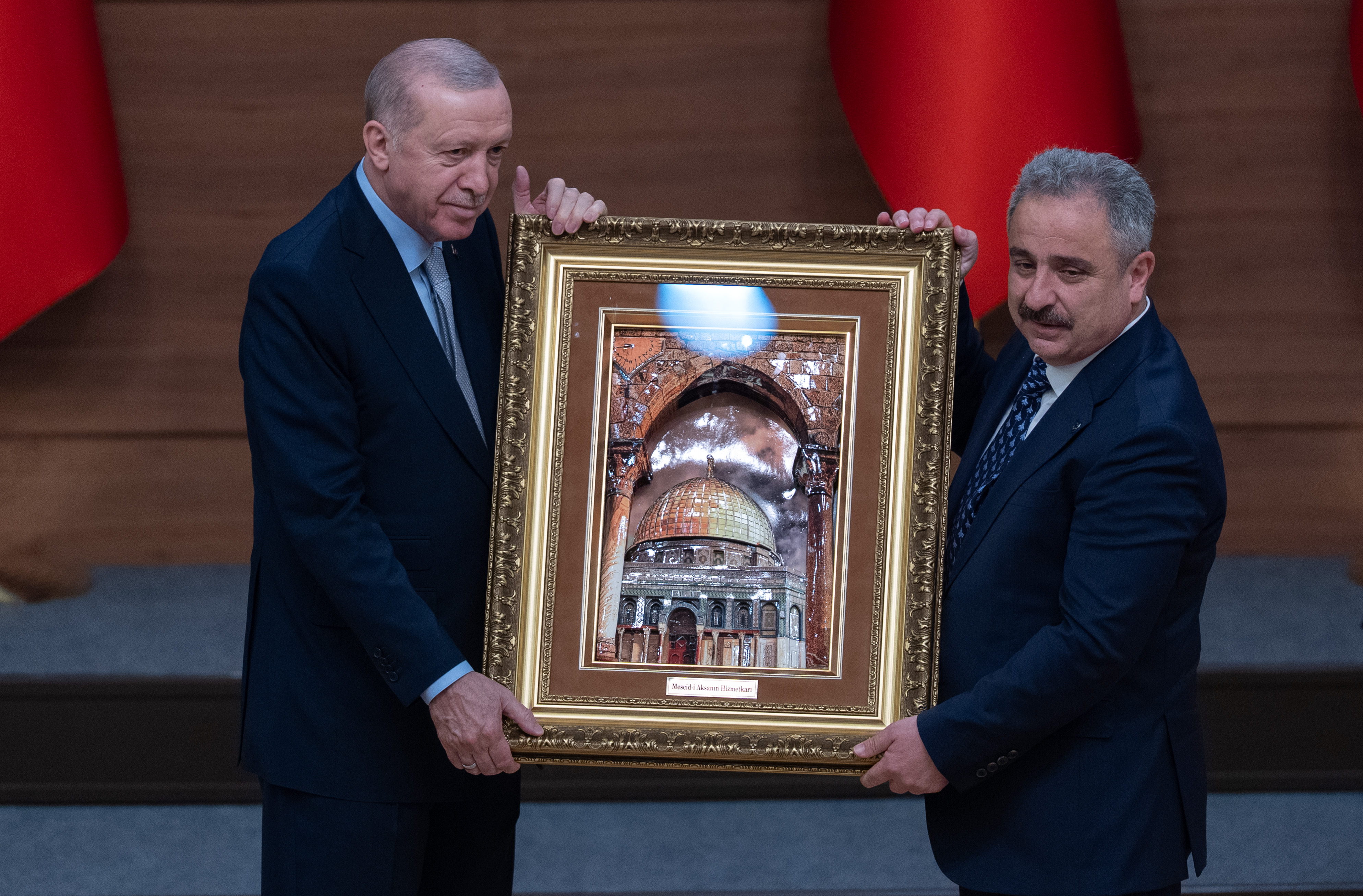 Törende, Türkiye Basın Federasyonu Genel Başkanı Sinan Burhan tarafından Cumhurbaşkanı Erdoğan'a Mescid-i Aksa görseli olan bir tablo armağan edildi.