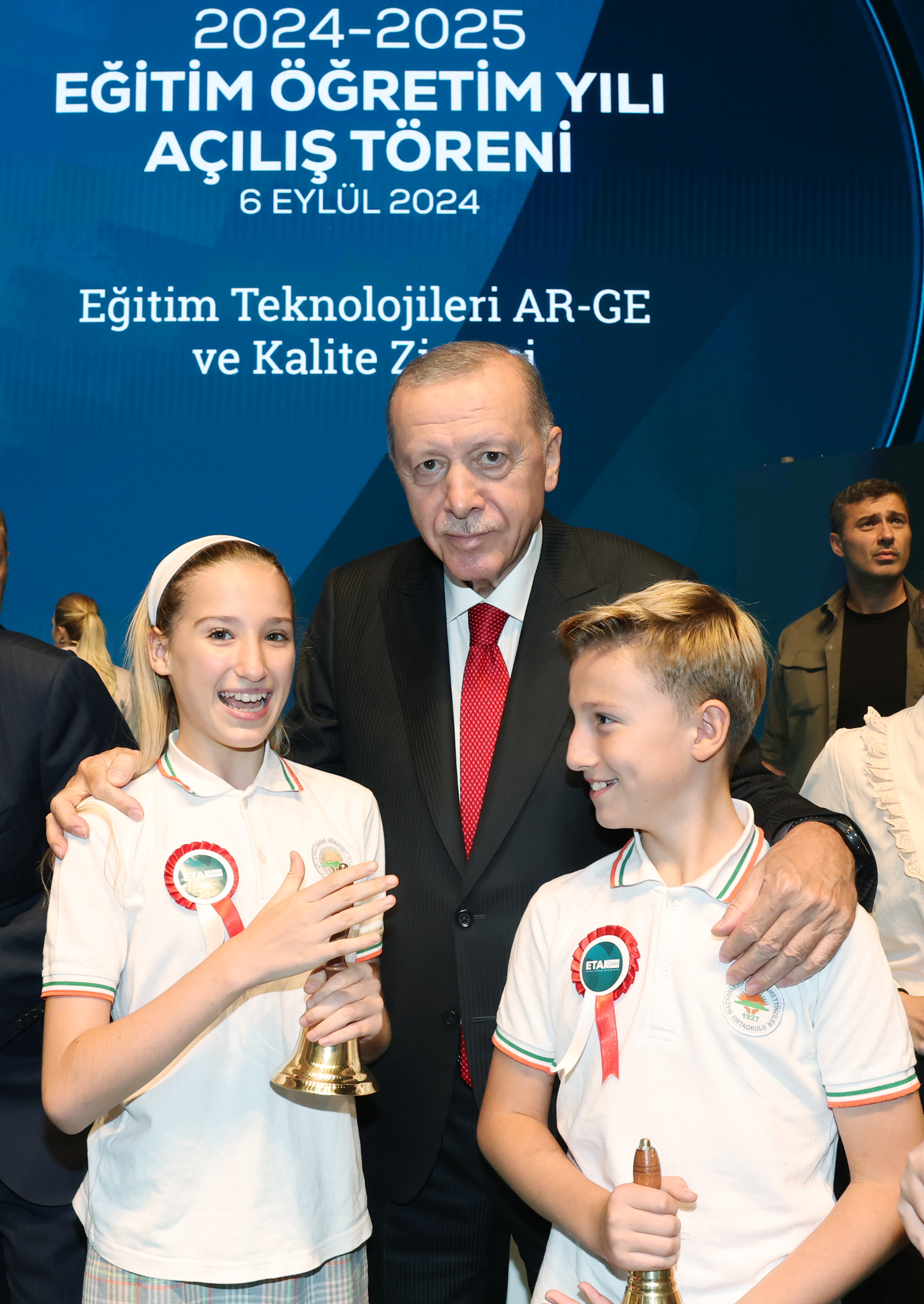 Programda, Cumhurbaşkanı Erdoğan beraberindeki öğrencilerle yeni eğitim yılının ilk ders zilini çaldı.