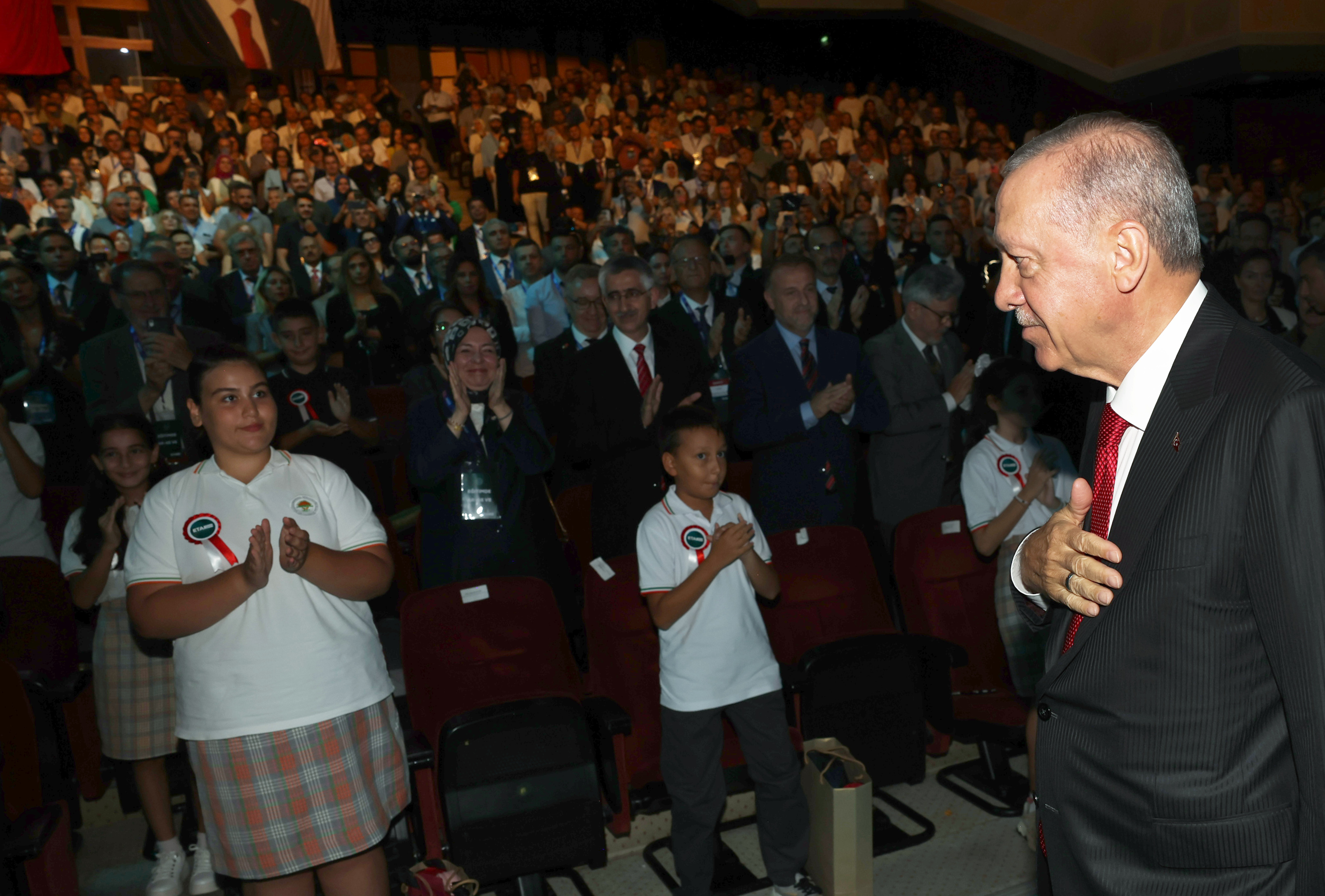 "2002'de 367 bin olan derslik sayımız hayırseverlerimizin de katkılarıyla 2 kattan fazla arttı. Buna bağlı olarak derslik başına düşen öğrenci sayısını ilköğretimde 36'dan 23'e, orta öğretimde 30'dan 22'ye indirdik. Böylece evlatlarımız daha kaliteli, daha ferah bir eğitim ortamına kavuştu. 2002'de 540 bin olan öğretmen sayımız 1,2 milyona yükseldi. Hükümetlerimiz döneminde 800 bin yeni öğretmen ataması yaptık. Ücretsiz ders kitapları, yemek, taşıma, şartlı destekler, burslar ve pansiyon hizmetleri gibi imkânları sunarak eğitimde fırsat eşitliğini güçlendirdik. Son 22 yılda yaklaşık 4 milyar adet ders kitabını ücretsiz dağıttık. Özel eğitim ihtiyacı olan 1 milyon 200 bin öğrencimizin evlerinde, hastanelerde, okullarda eğitime erişimlerini sağlıyoruz."