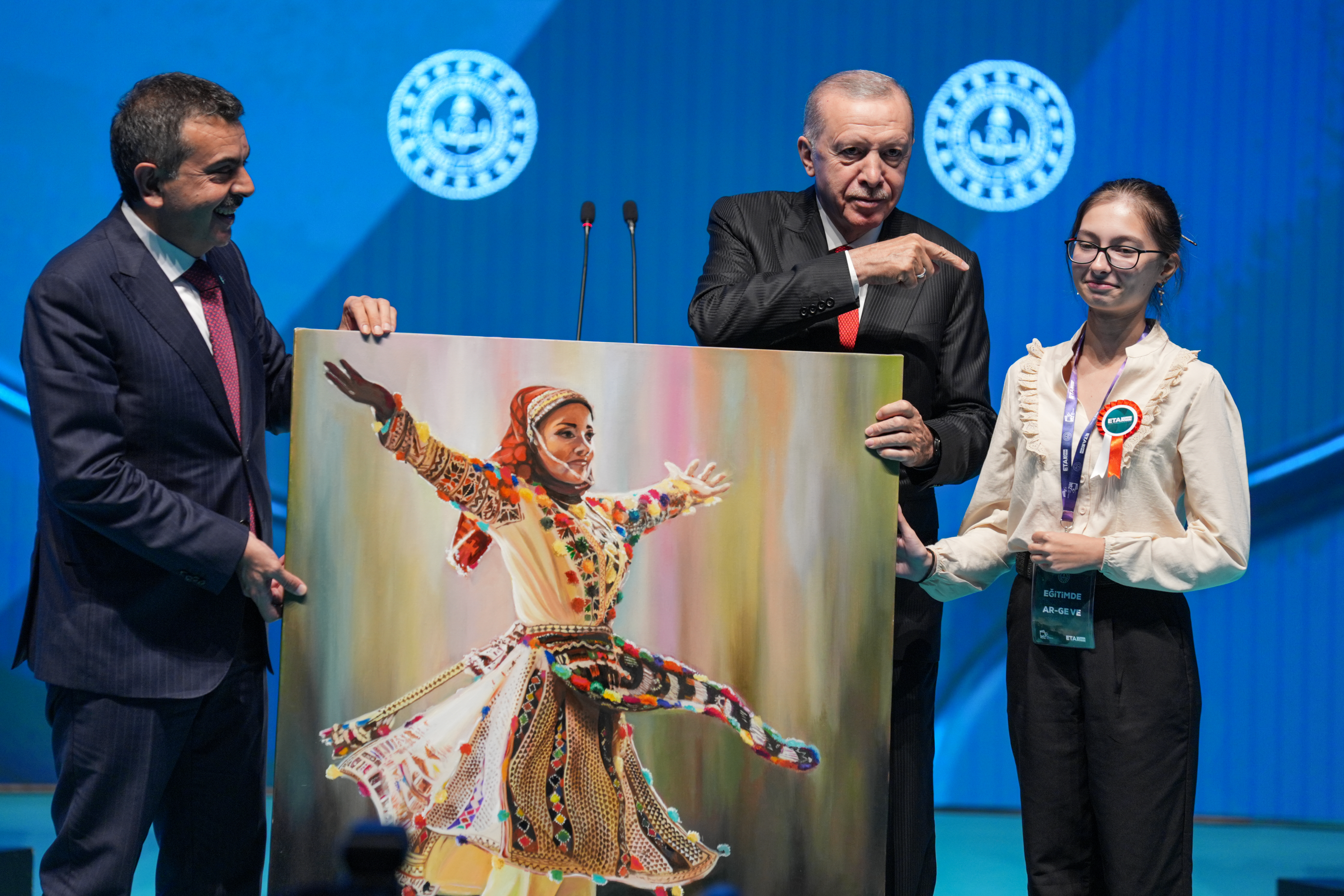 Törende, Milli Eğitim Bakanı Tekin, bir öğrenci tarafından yapılan resmi, Cumhurbaşkanı Erdoğan'a takdim etti. Cumhurbaşkanı Erdoğan, bu esnada sahnede olan ve resmi çizen öğrenciyi tebrik etti.