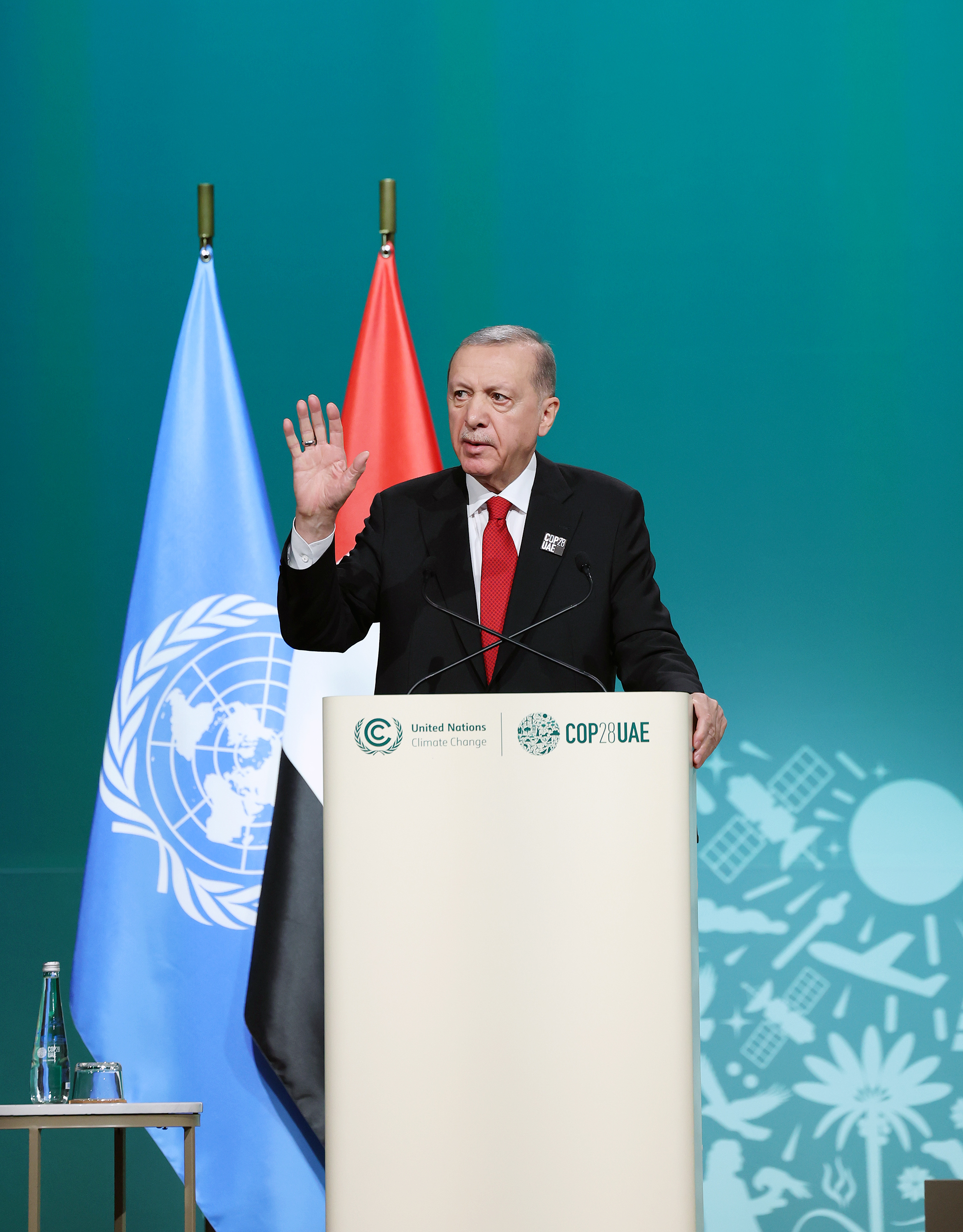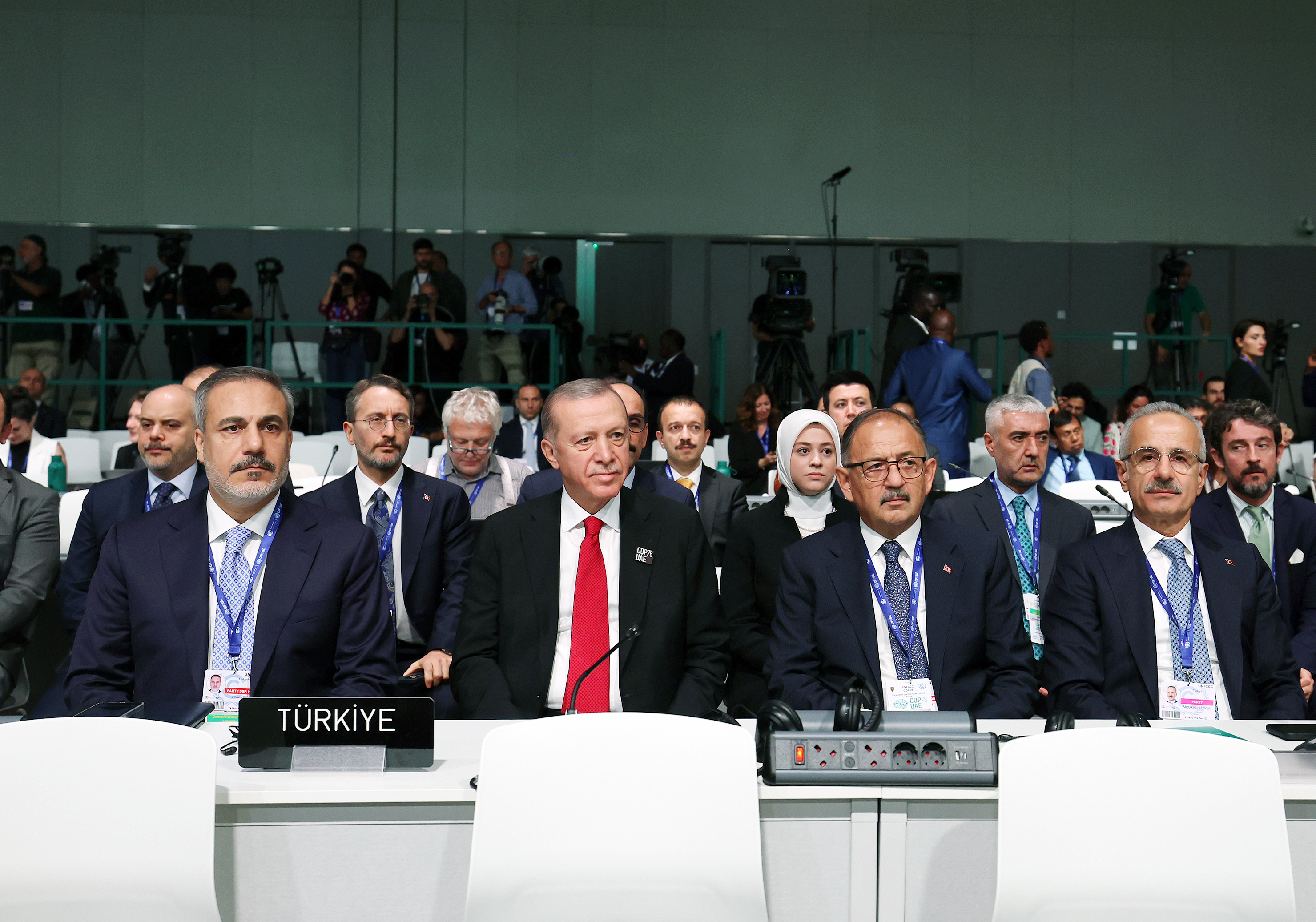 Cumhurbaşkanı Erdoğan, 6 Şubat'ta meydana gelen Kahramanmaraş merkezli deprem felaketine rağmen Türkiye'nin ne ekonomideki ne de iklim değişikliğiyle mücadeledeki hedeflerinden koptuğunu belirterek, "14 milyon insanımızı ve 11 ilimizi olumsuz etkileyen depremlerin yol açtığı yaraları hamdolsun hızla sarıyoruz. Şehirlerimizin yeniden inşasında da çevreyi korumak, iklim ve çevre dostu yapılar inşa etmek, önceliklerimizin başında yer almaktadır." dedi.