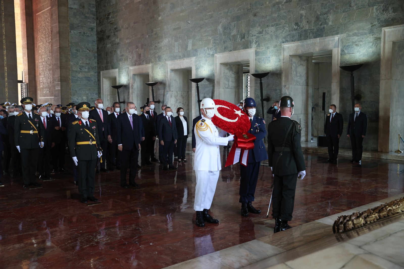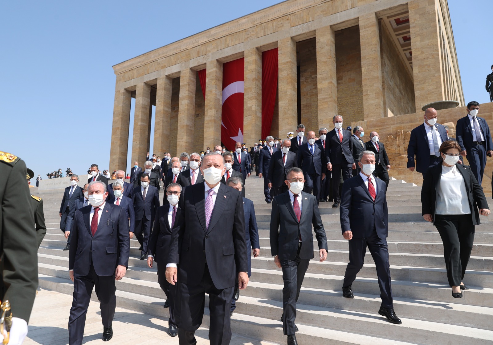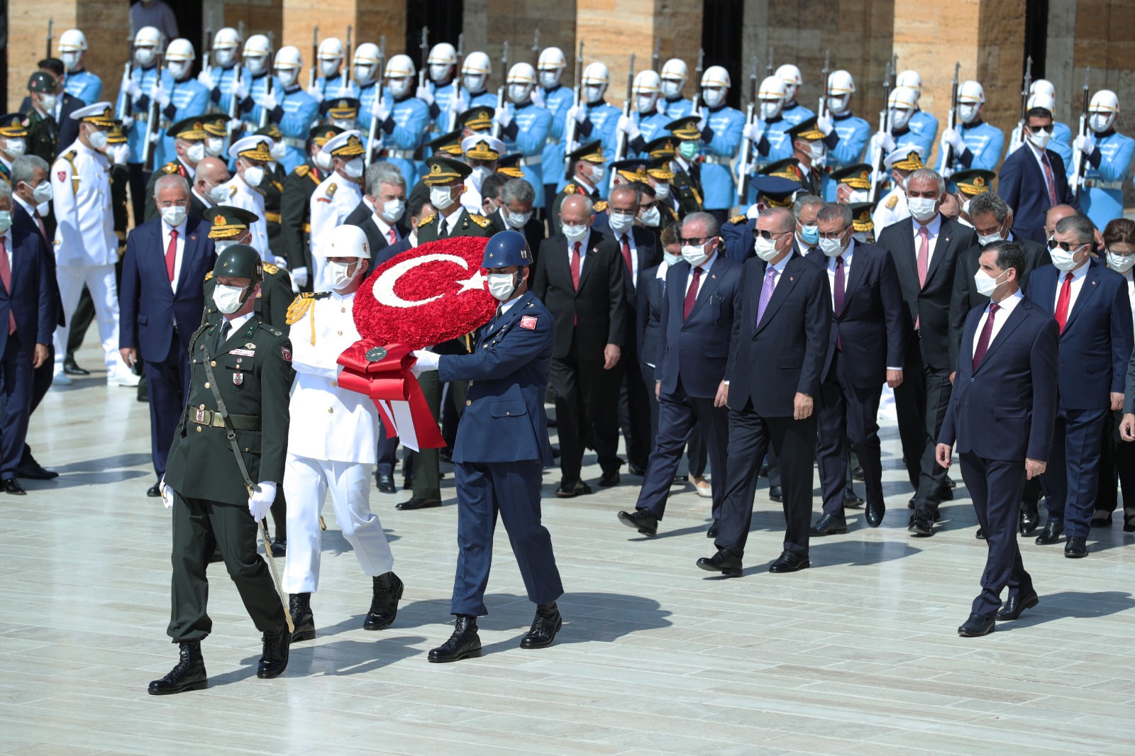 Cumhurbaşkanı Erdoğan başkanlığındaki kortejde, TBMM Başkanı Mustafa Şentop, Cumhurbaşkanı Yardımcısı Fuat Oktay, CHP Genel Başkanı Kemal Kılıçdaroğlu, Cumhurbaşkanlığı Kabinesi üyeleri, MHP Genel Başkanı Devlet Bahçeli, İYİ Parti Genel Başkanı Meral Akşener, yüksek yargı organlarının başkanları, komutanlar, siyasi partilerin temsilcileri, bürokratlar ve diğer devlet erkanı yer aldı.
