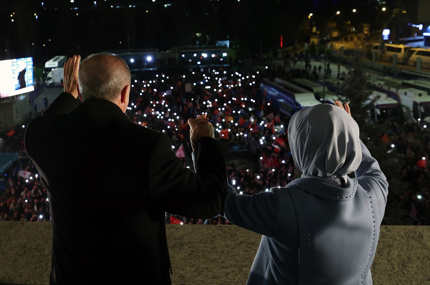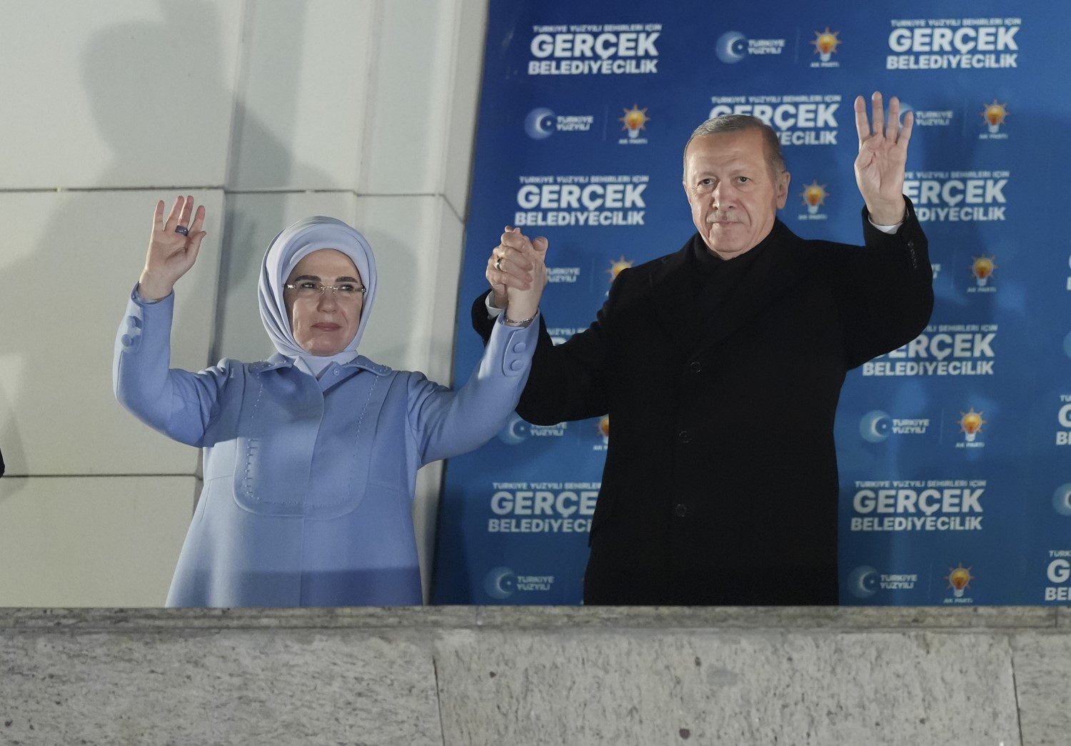 Cumhurbaşkanı ve AK Parti Genel Başkanı Recep Tayyip Erdoğan, Mahallî İdareler Genel Seçimleri'nin ardından AK Parti Genel Merkezi balkonundan vatandaşlara ve partililere hitap etti.