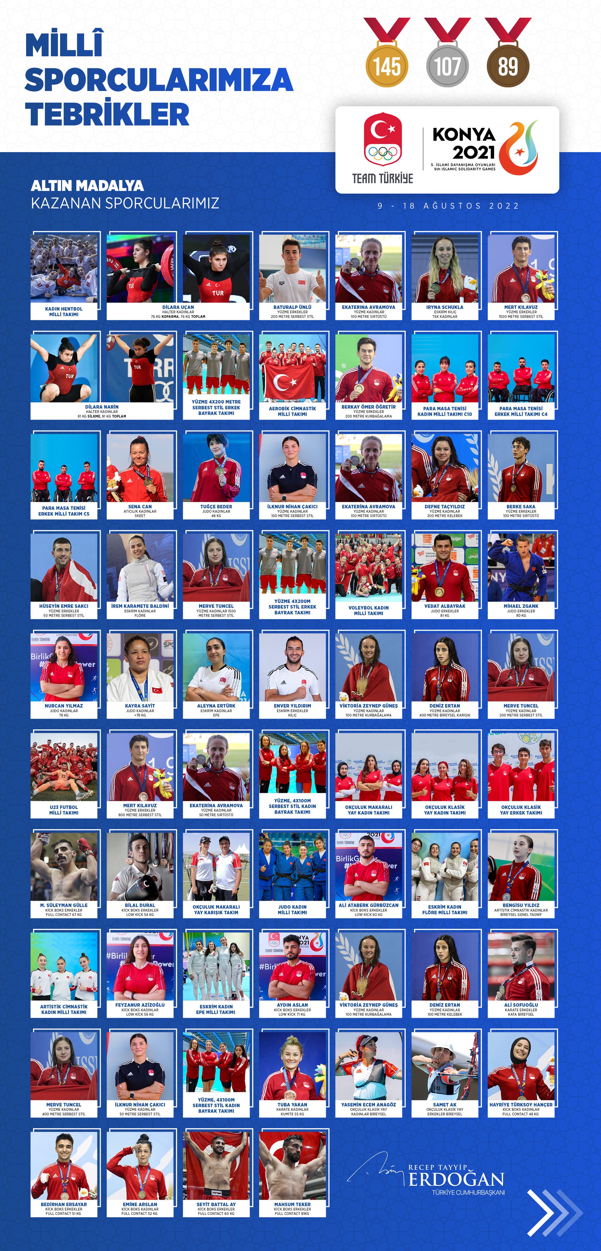 Cumhurbaşkanı Erdoğan, sosyal medya hesabından yaptığı paylaşımda, "Konya’da düzenlenen 5. İslami Dayanışma Oyunları'nda alın teri döken, toplam 341 madalya kazanarak tarihi bir netice elde eden tüm millî sporcularımızı tebrik ediyorum. İslam aleminin farklı köşelerinden ülkemize teşrif eden misafirlerimize en kalbi şükranlarımı ifade ediyorum." ifadelerini kullandı.