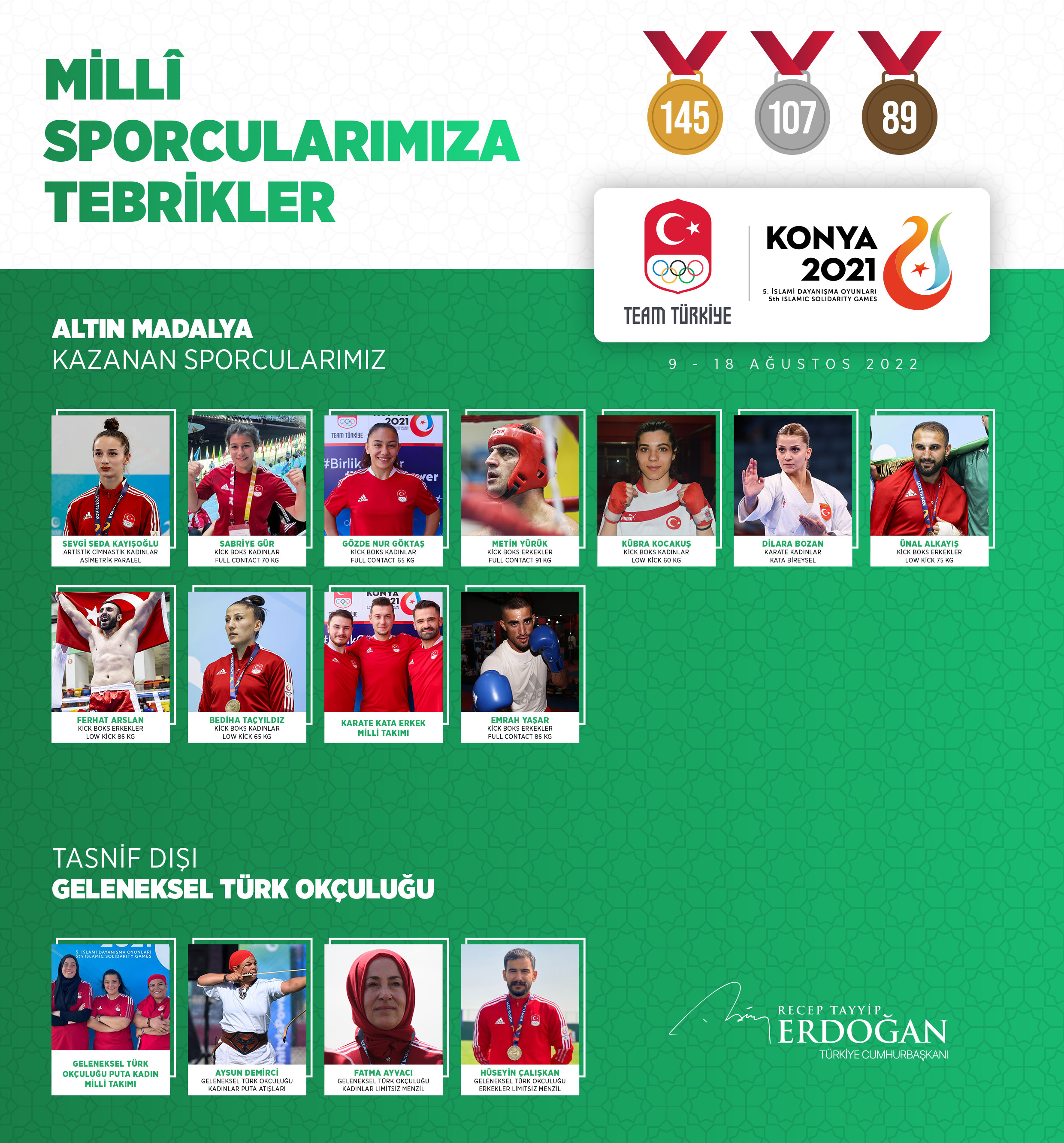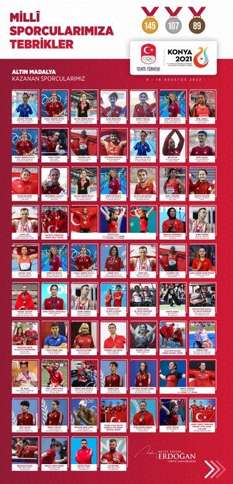 Cumhurbaşkanı Erdoğan, paylaşımında sporcuların fotoğraflarına da yer verdi.