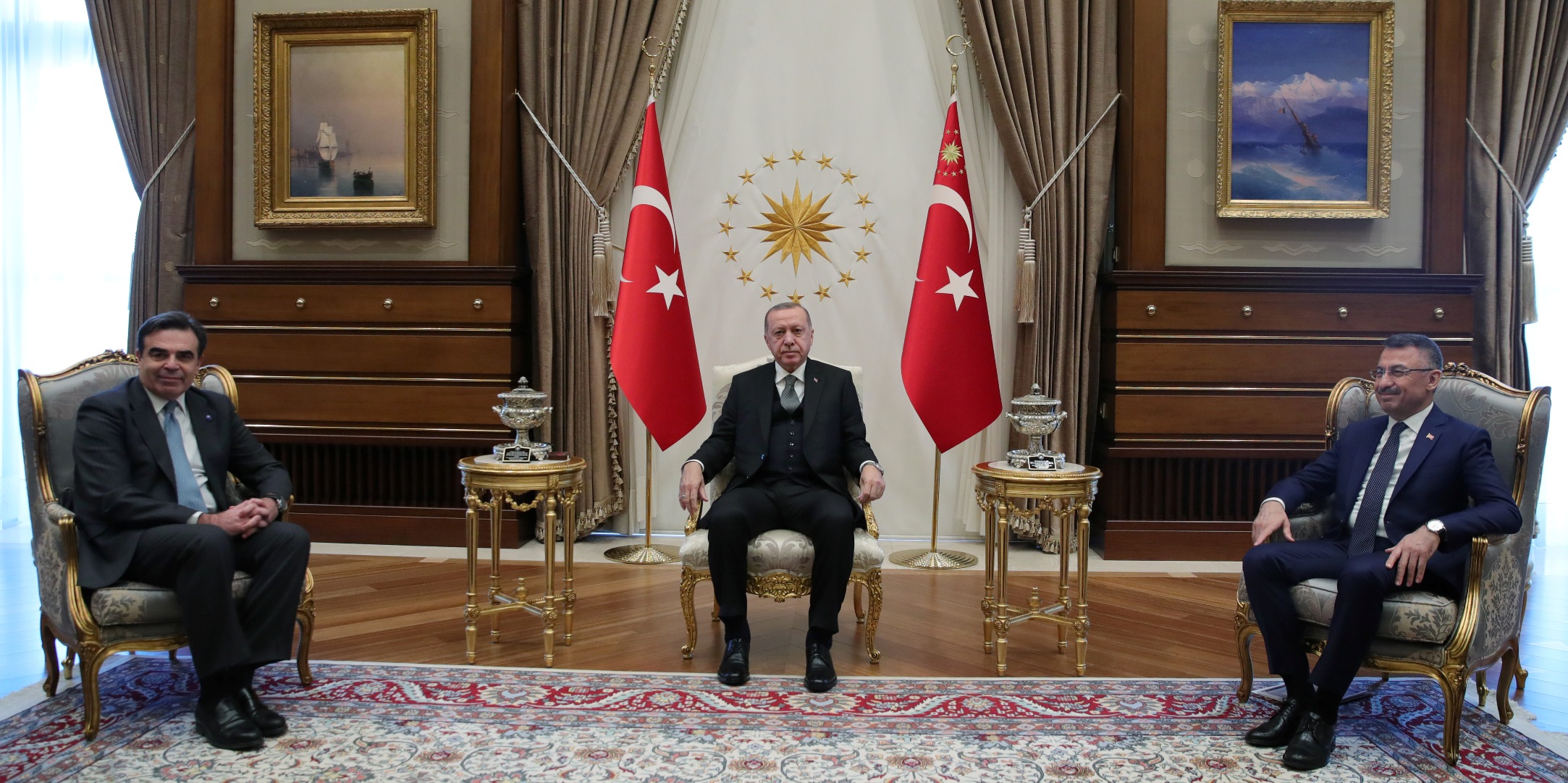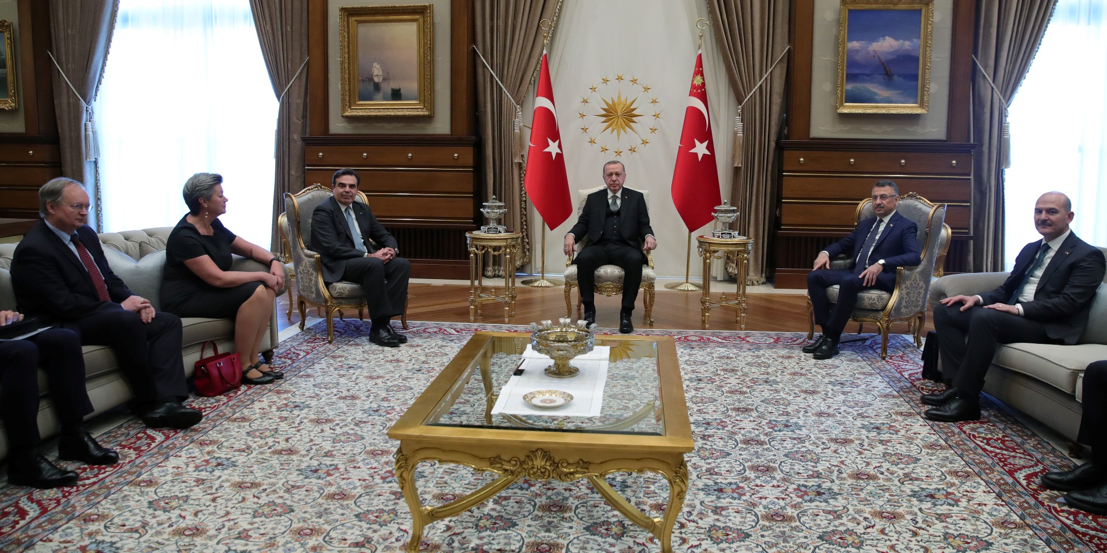 Cumhurbaşkanlığı Külliyesi'nde 55 dakika süren kabulde Cumhurbaşkanı Yardımcısı Fuat Oktay ve İçişleri Bakanı Süleyman Soylu da hazır bulundu.