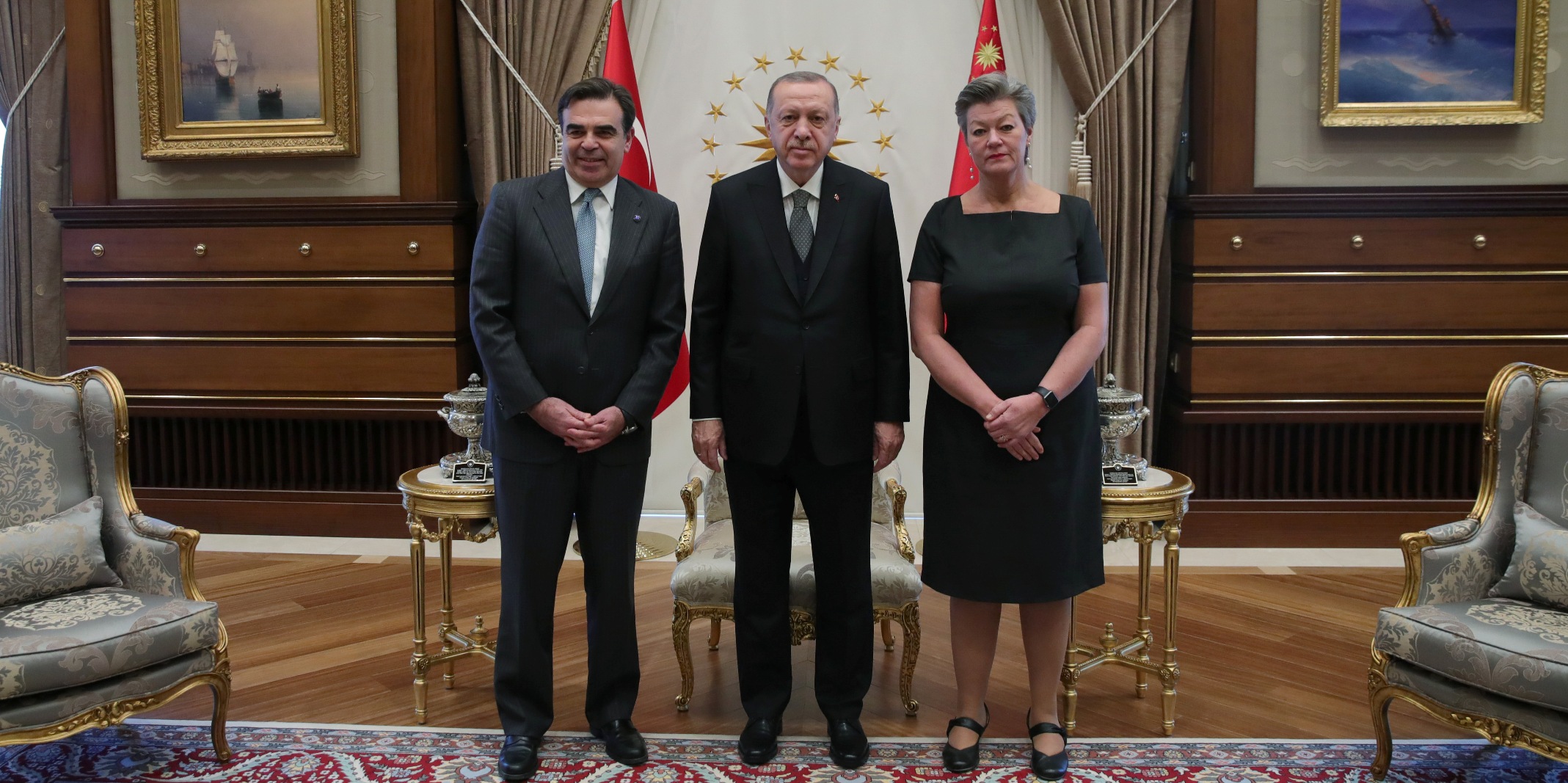 Cumhurbaşkanı Recep Tayyip Erdoğan, AB Komisyonu Başkan Yardımcısı Margaritis Schinas ve AB İçişleri Komiseri Ylva Johansson'ı kabul etti.