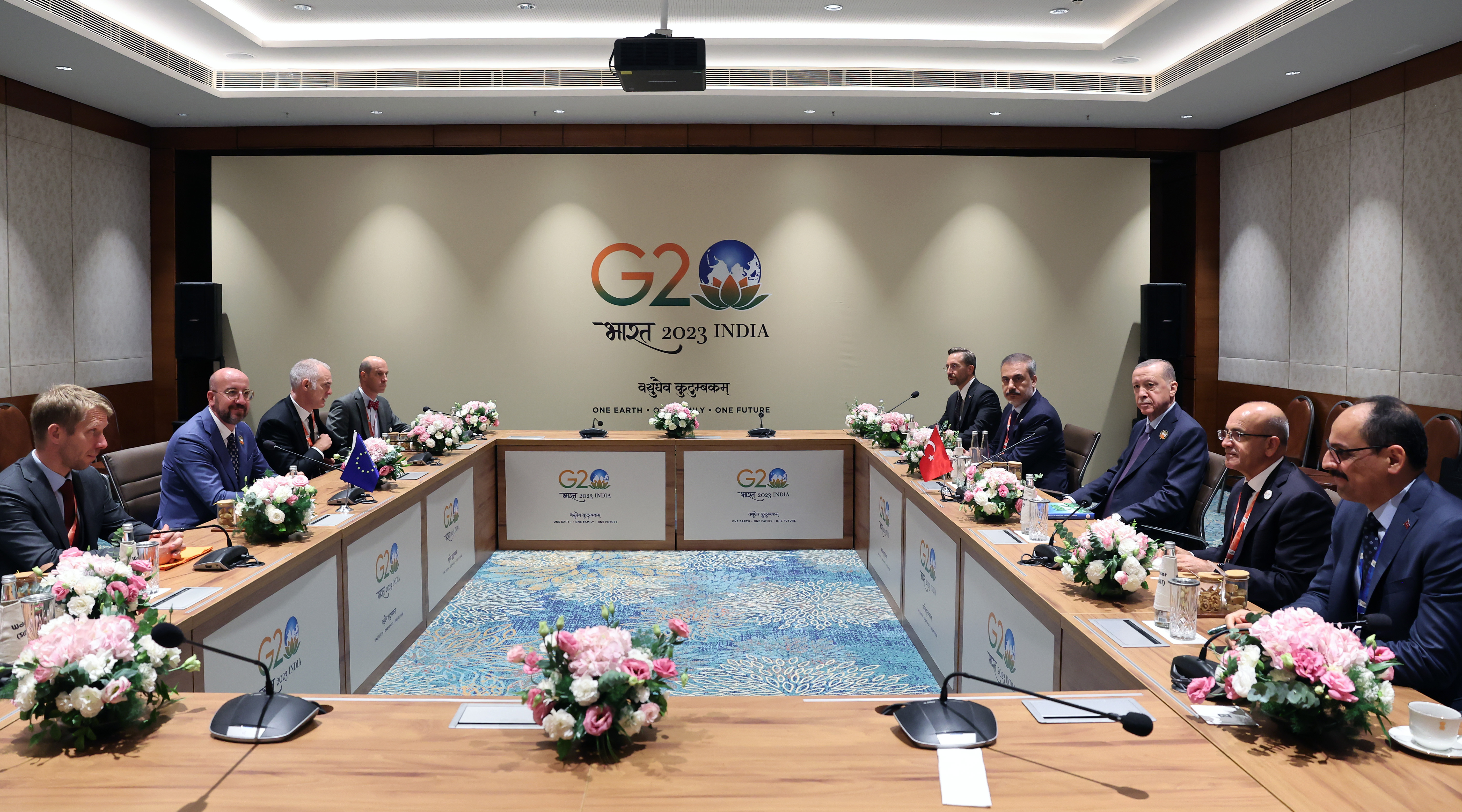 Cumhurbaşkanı Erdoğan, Bharat Mandapam Uluslararası Fuar ve Kongre Merkezi'nde gerçekleştirilen zirvenin ardından AB Konseyi Başkanı Charles Michel ile görüştü.