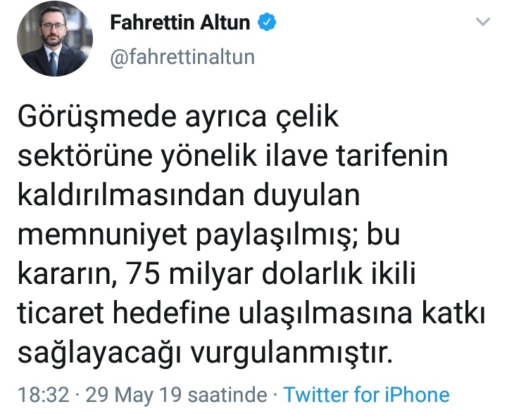 Görüşmede ayrıca çelik sektörüne yönelik ilave tarifenin kaldırılmasından duyulan memnuniyet paylaşılmış; bu kararın, 75 milyar dolarlık ikili ticaret hedefine ulaşılmasına katkı sağlayacağı vurgulanmıştır.