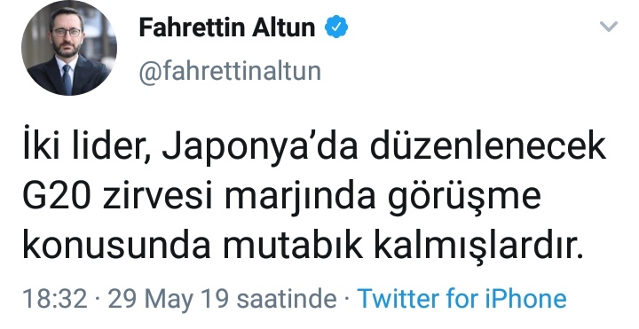 İki lider, Japonya'da düzenlenecek G20 zirvesi marjında görüşme konusunda mutabık kalmışlardır."