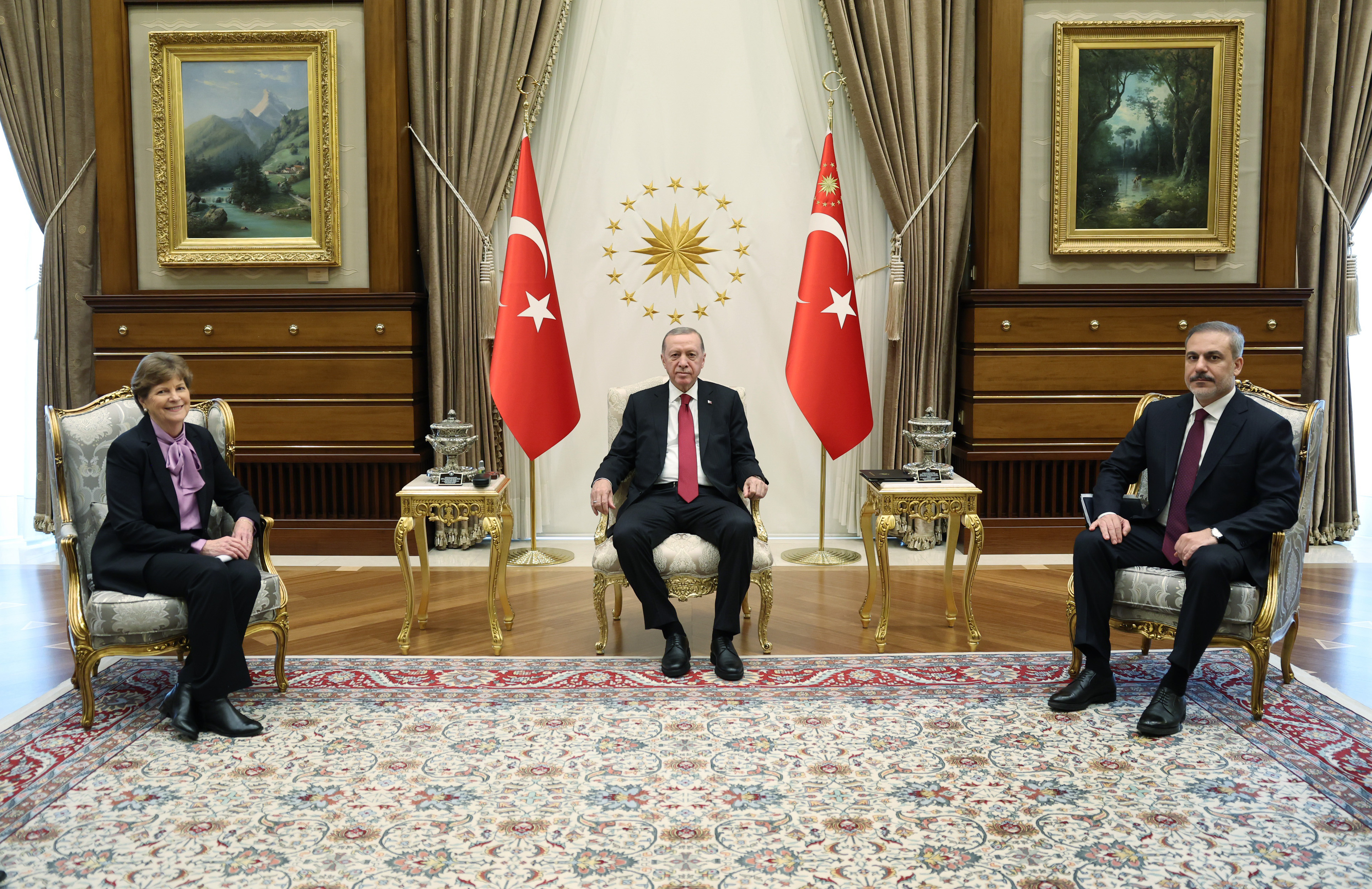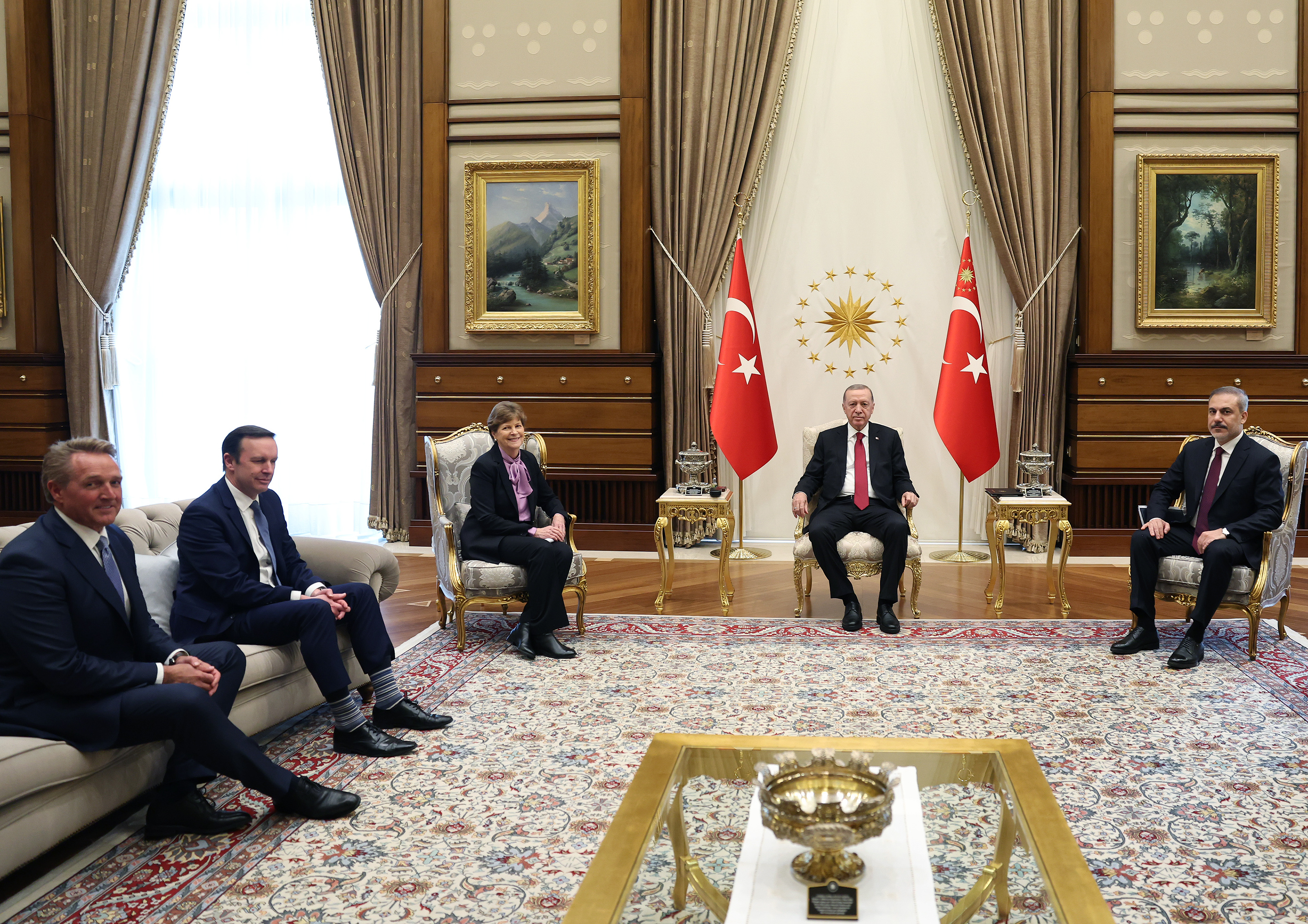 Cumhurbaşkanı Recep Tayyip Erdoğan, ABD'li Senatörler Jeanne Shaheen ve Chris Murphy'i Cumhurbaşkanlığı Külliyesi'nde kabul etti.