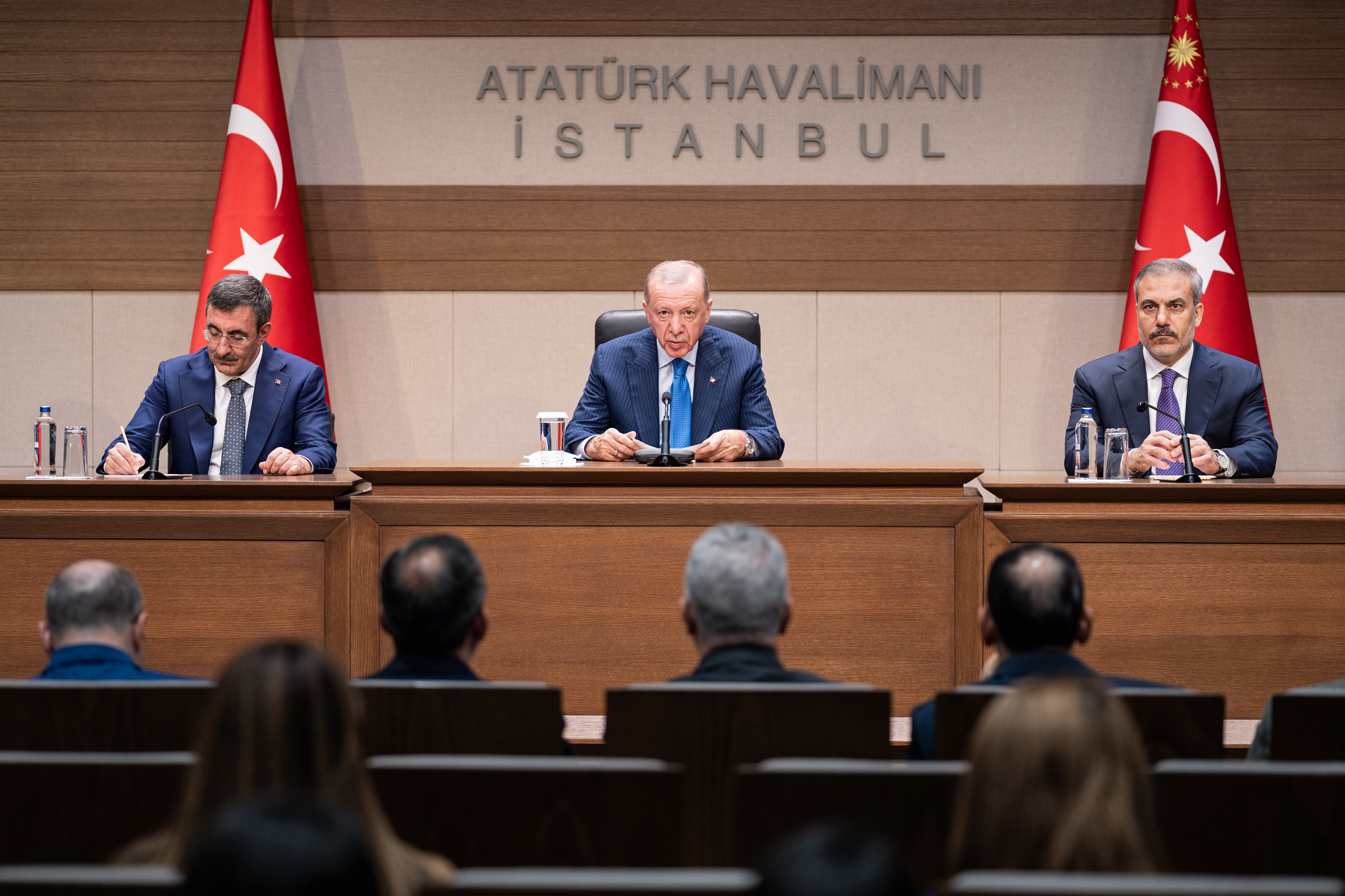 Cumhurbaşkanı Recep Tayyip Erdoğan, Birleşmiş Milletler (BM) 79. Genel Kurulu'na katılmak için ABD'ye gerçekleştireceği ziyaret öncesi Atatürk Havalimanı Devlet Konukevi'nde düzenlenen basın toplantısında konuştu.