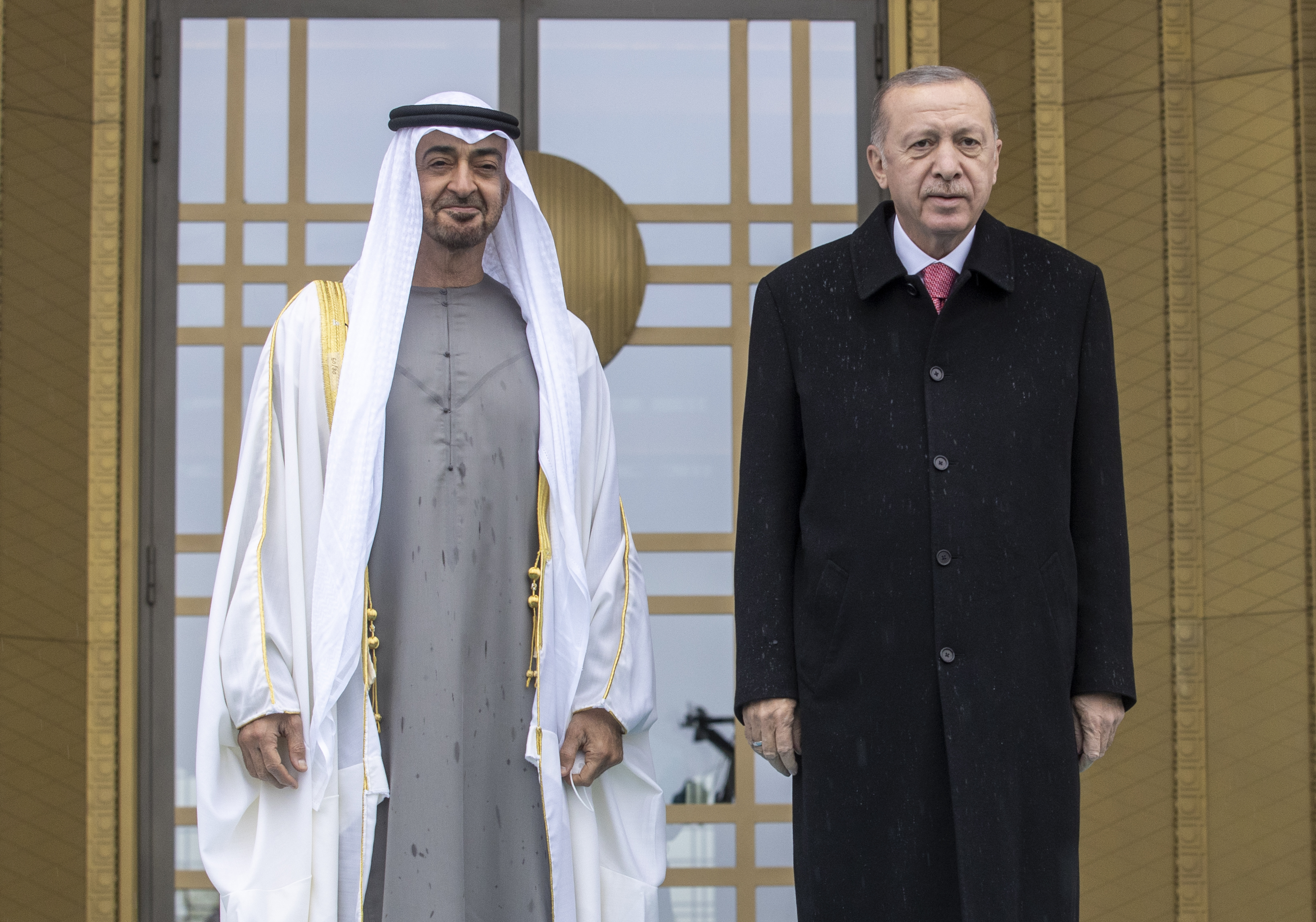 Cumhurbaşkanı Erdoğan, Veliaht Prens bin Zayed'i, Cumhurbaşkanlığı Külliyesi'nin ana giriş kapısında karşıladı. Cumhurbaşkanı Erdoğan ve Veliaht Prens bin Zayed'in tören alanındaki yerlerini almalarının ardından, 21 pare top atışı eşliğinde iki ülkenin milli marşları çalındı.