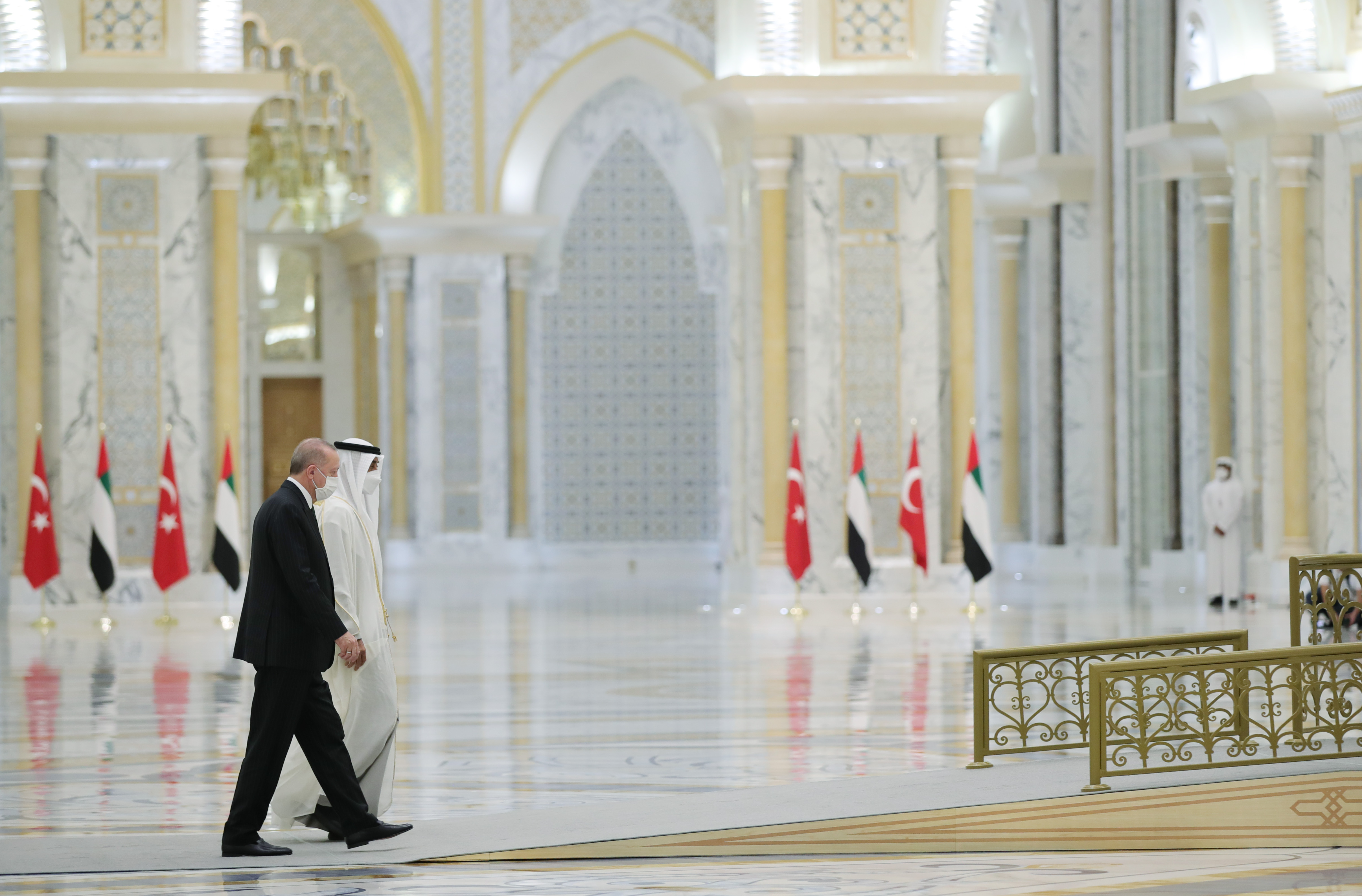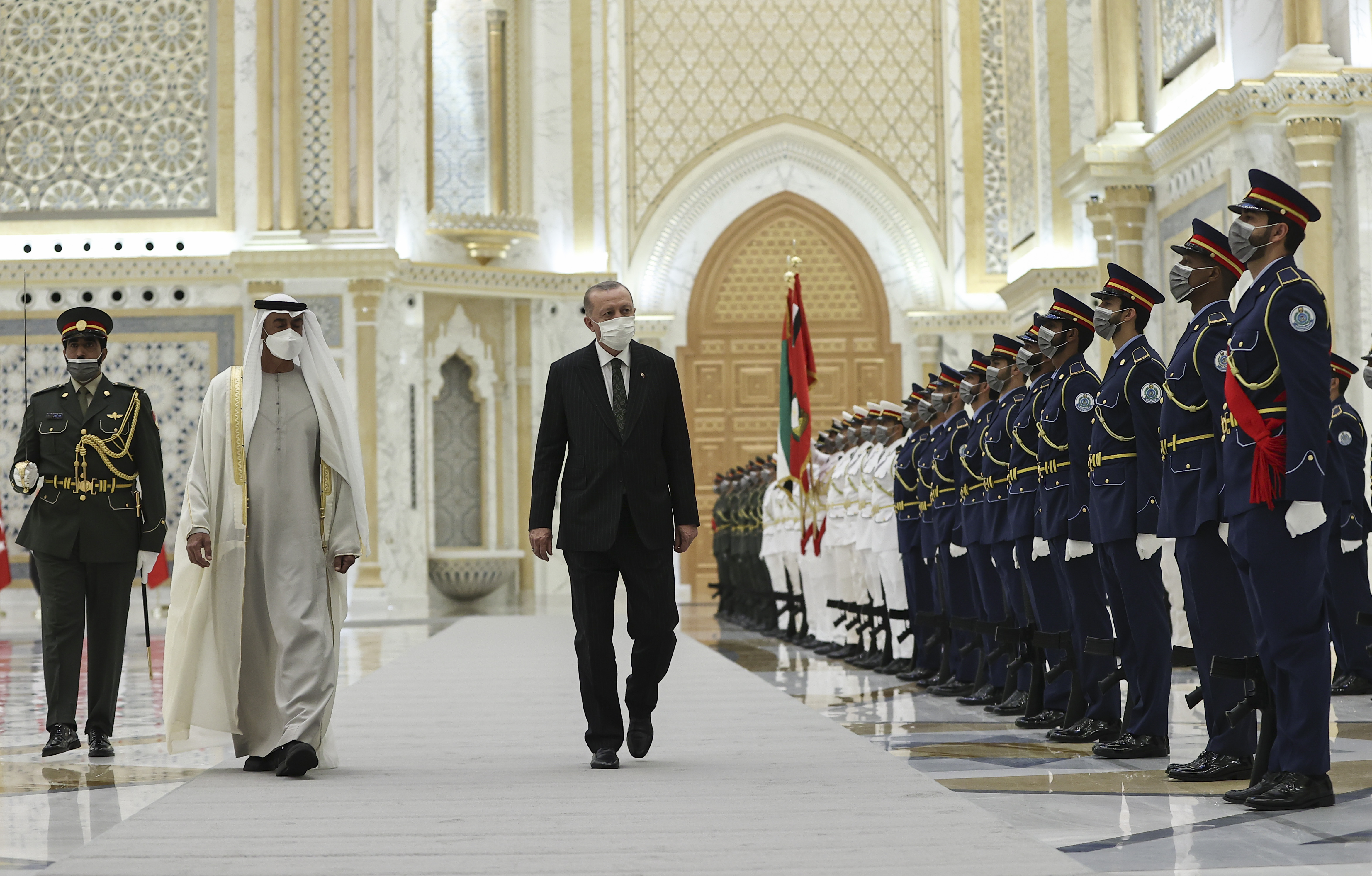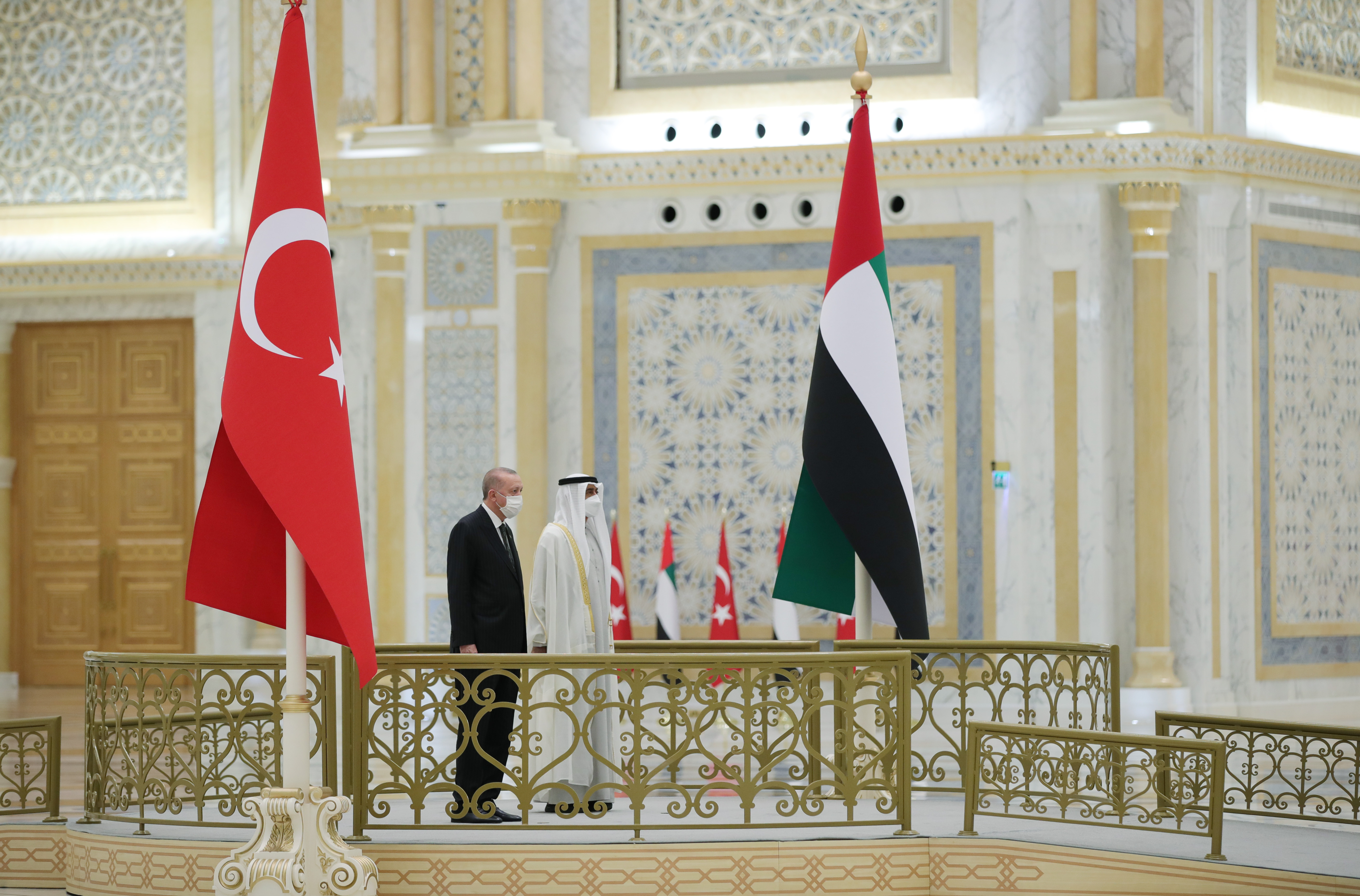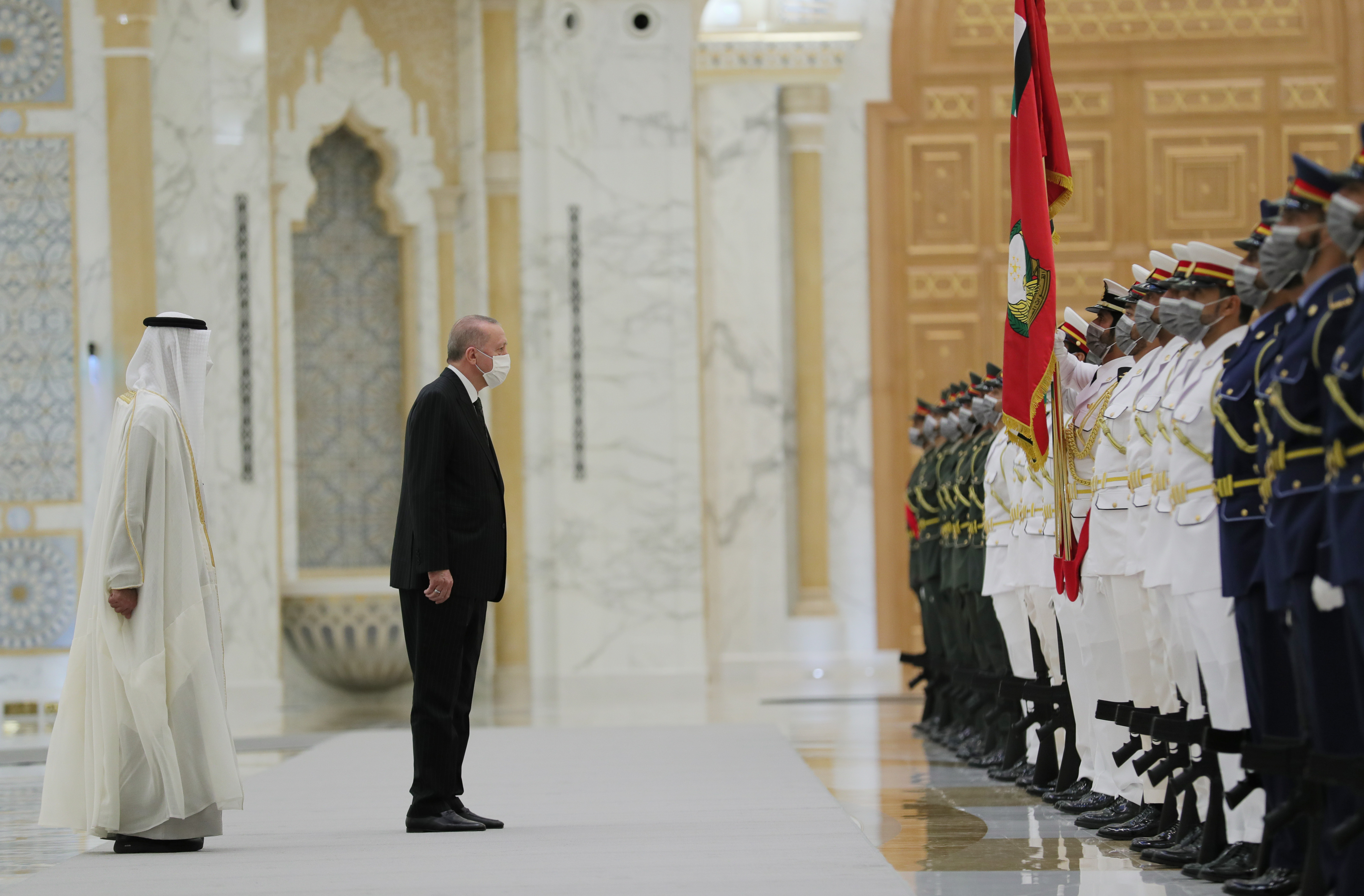 Cumhurbaşkanı Erdoğan, tören kıtasını selamladı. Heyetlerini birbirine takdim eden Cumhurbaşkanı Erdoğan ve Bin Zayid, Türkiye ve Birleşik Arap Emirlikleri bayrakları önünde gazetecilere poz verdi.