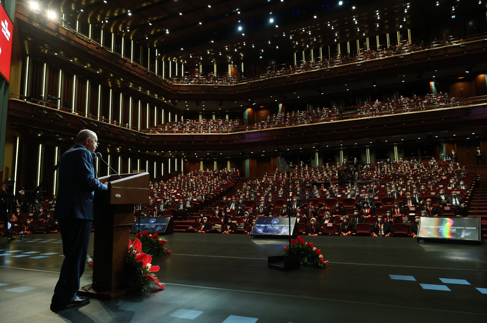 Türk hukuk sisteminin en büyük açmazının, neredeyse her on yılda bir antidemokratik bir müdahaleye maruz kalması olduğunu vurgulayan Cumhurbaşkanı Erdoğan, "Aynı şekilde yargı camiamız da uzun yıllar boyu ya vesayetçilerin ya da halka rağmen halkçılık yapan jakoben zihniyetin tasallutu altında kalmıştır. Öyle ki bu ülke, sadece belli siyasi görüşe ve meşrebe mensup hakim ve savcı almakla övünen adalet bakanları görmüştür. Güya adaleti tesis etmek adına bir sağdan bir soldan gençlerin dar ağacına gönderildiği günler, dönemler yaşadık." diye konuştu.
