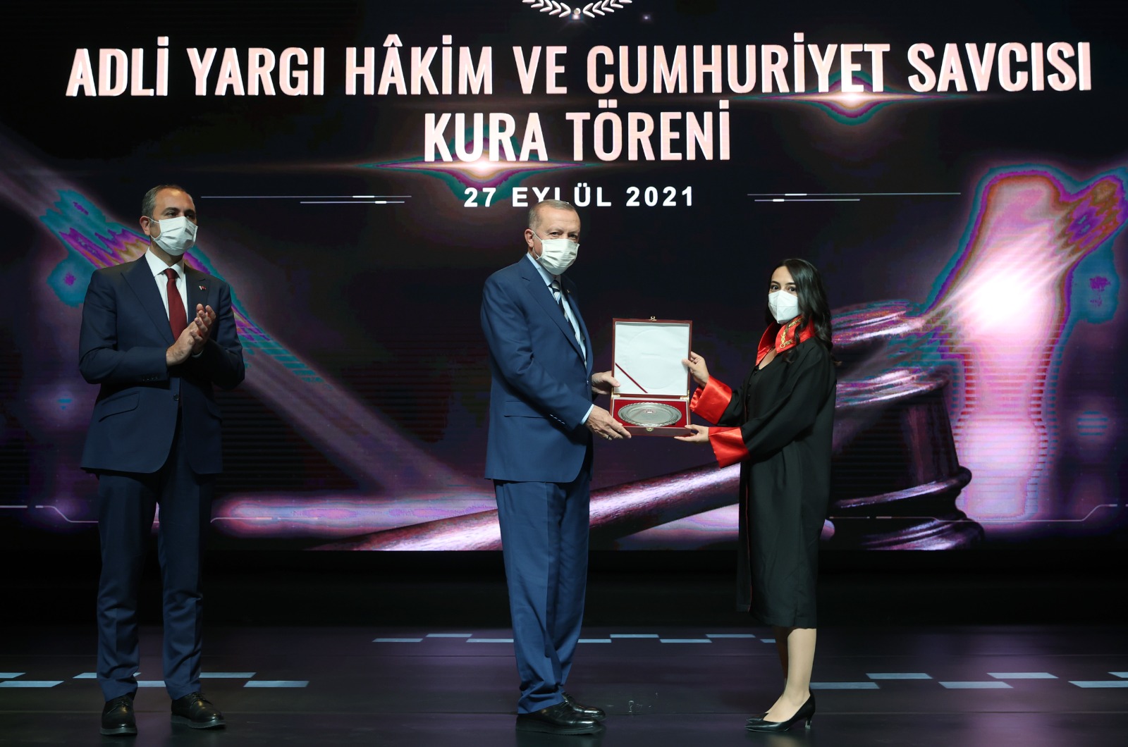 Cumhurbaşkanı Erdoğan, hitabının ardından 24. dönem adli yargı hakim adayları birincileri Şeyma Akgül ve Songül Kaçmaz ile 24. dönem adli yargı cumhuriyet savcısı adayları birincisi Selen Güllü'ye plaketlerini verdi.