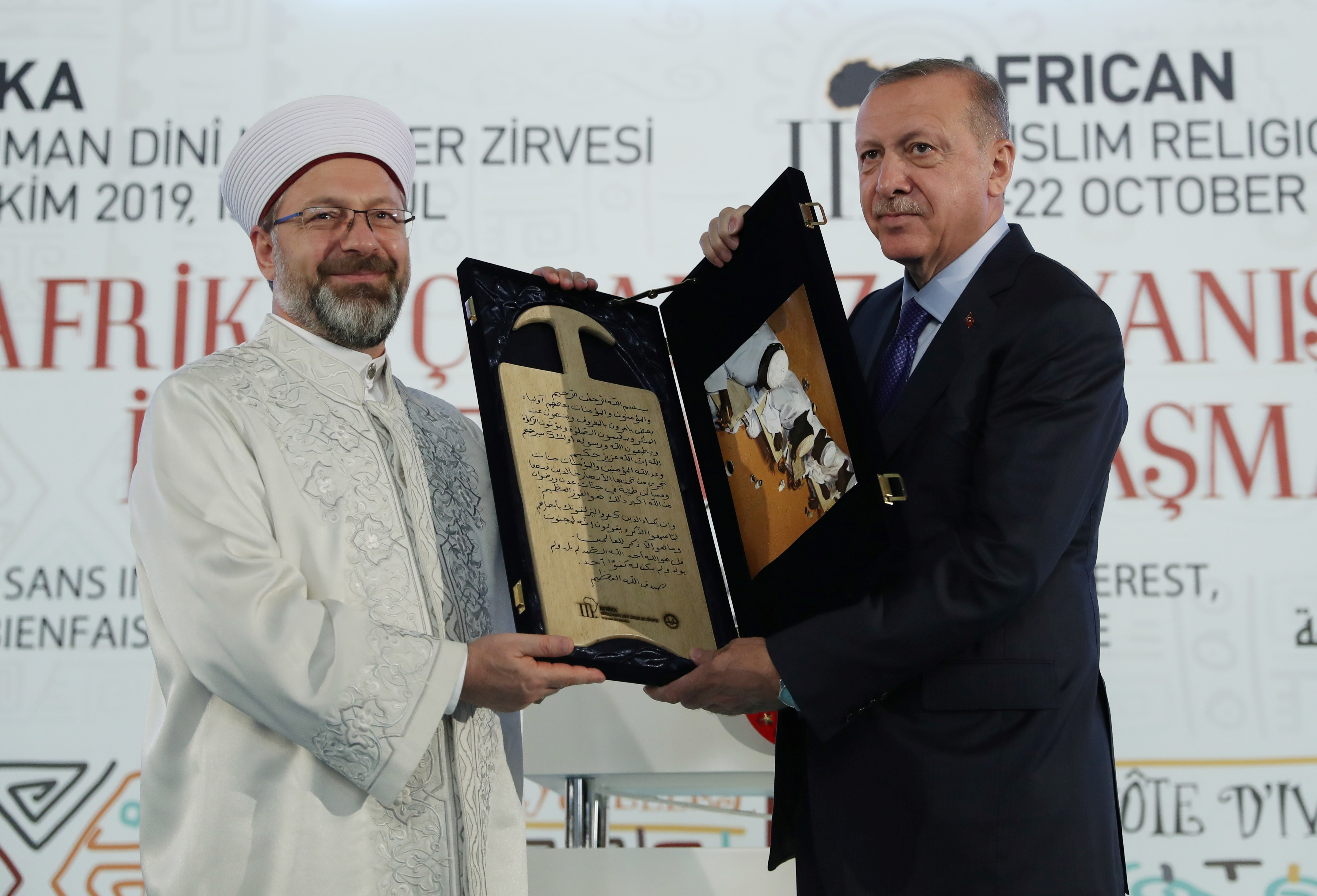 Diyanet İşleri Başkanı Prof. Dr. Ali Erbaş, Erdoğan'a Afrikalı çocuklar tarafından yapılan ve üzerinde ayetlerin yazılı olduğu bir ahşap hediye etti.