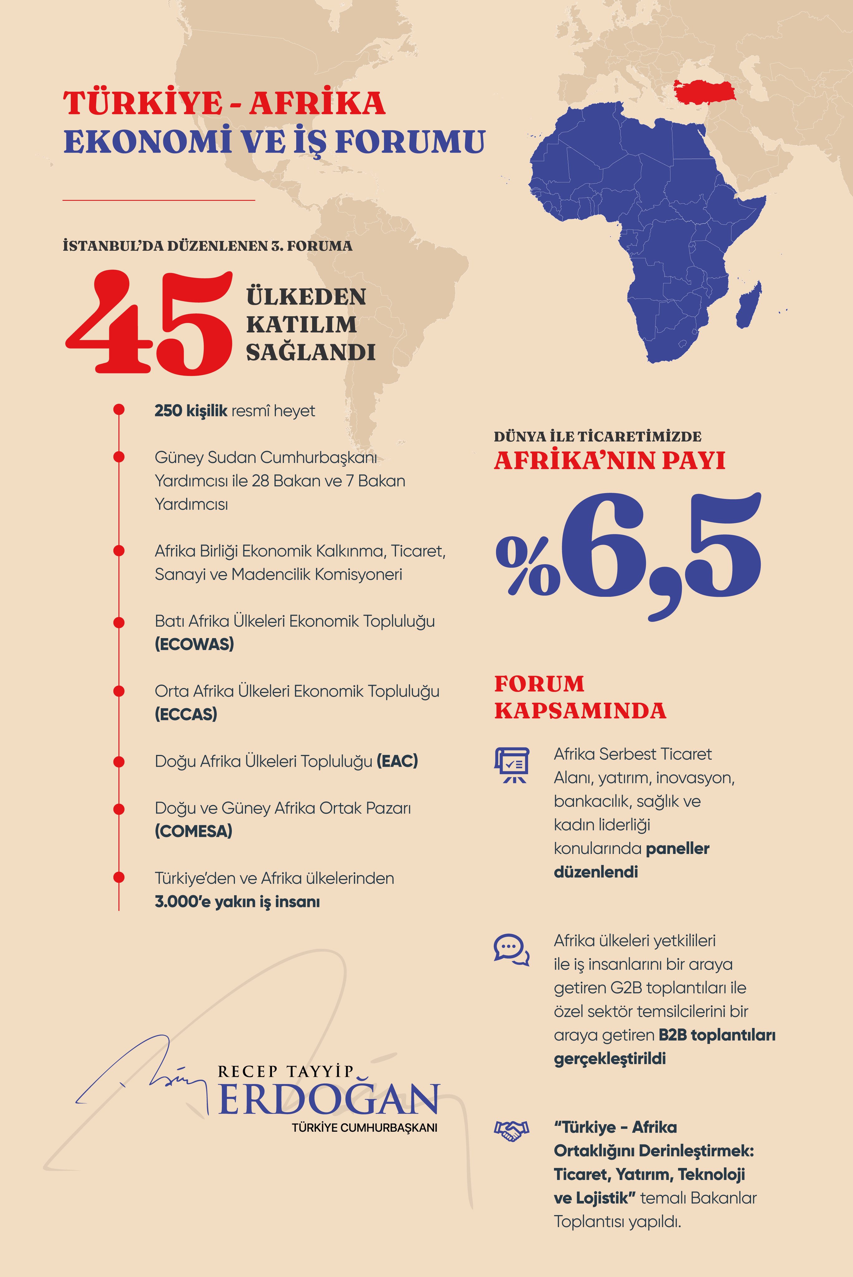 Paylaşımında bir infografiğe de yer veren Cumhurbaşkanı Erdoğan, kendisinin de konuşma yaptığı Türkiye-Afrika Ekonomi ve İş Forumu'na 45 ülkeden katılım sağlandığını belirtti.