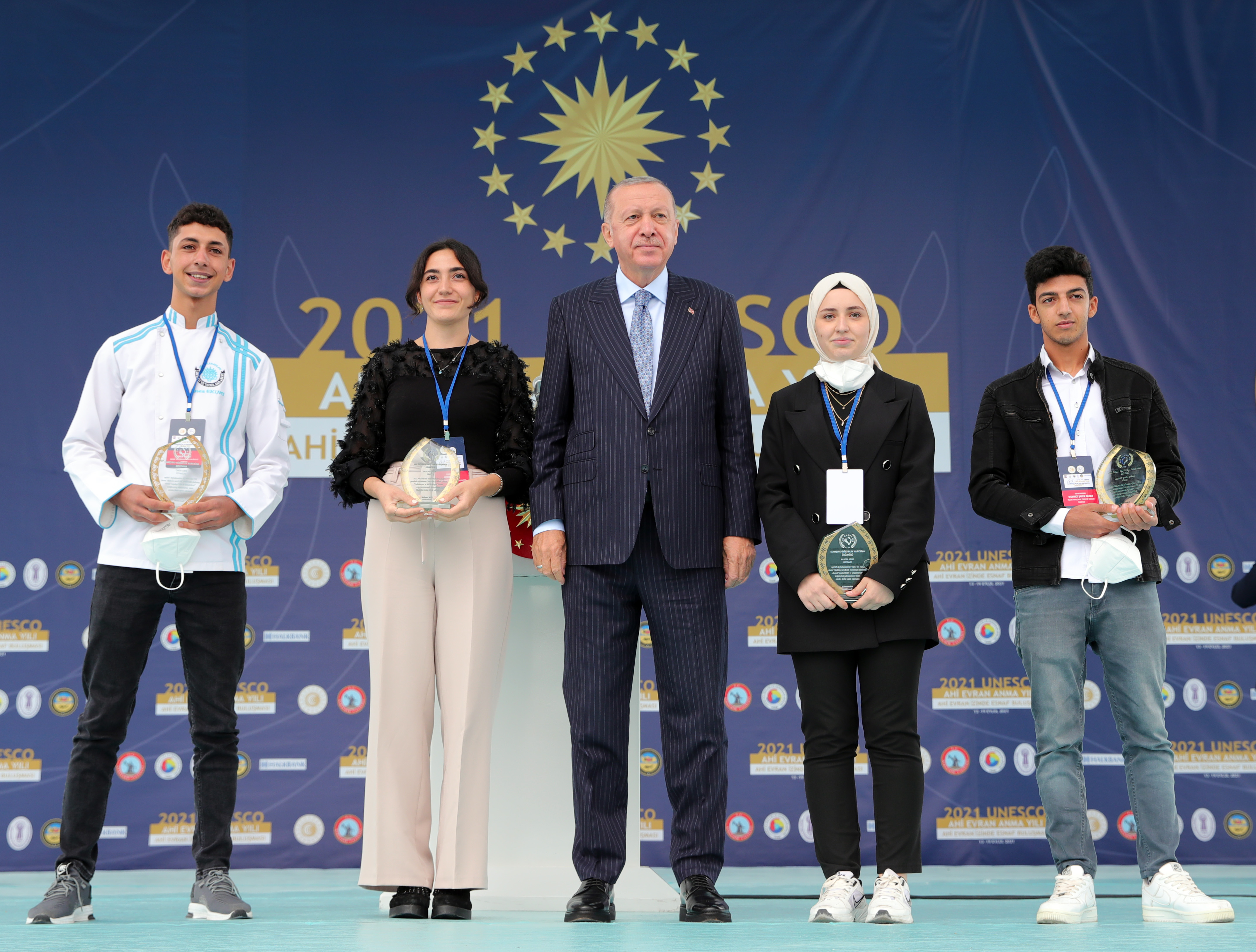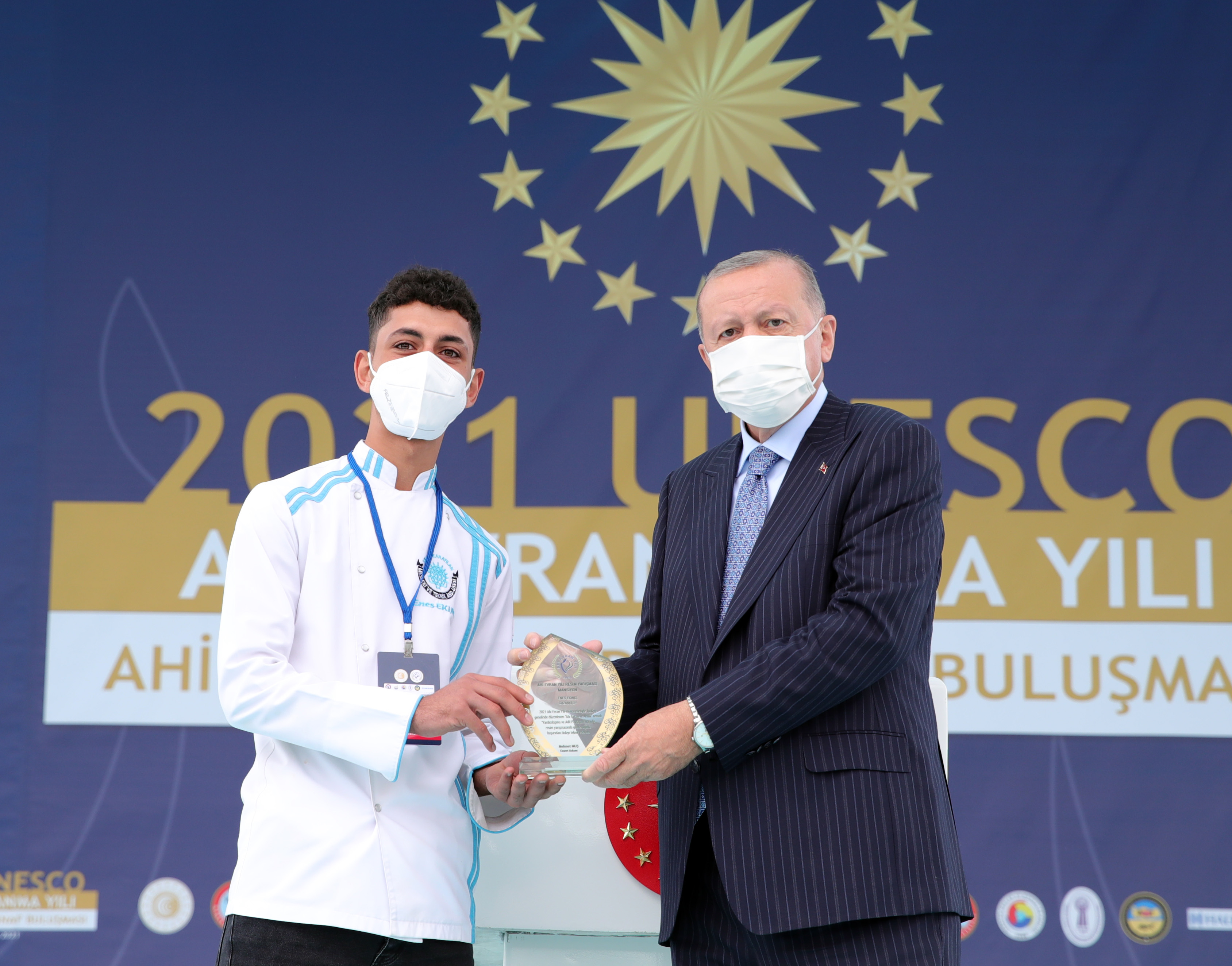 Cumhurbaşkanı Erdoğan, hitabının ardından Ahi Evran Yılı Resim Yarışması'nda dereceye girenlere ödüllerini verdi. Cumhurbaşkanı Erdoğan, 34. Ahilik Haftası Ödül Töreni kapsamında, Trabzon'dan Yaprak Meral'a "yılın çırağı", Antalya'dan Ali Korkmaz'a "yılın kalfası", Hatay'dan Behzat Böke'ye "yılın ahisi" ödülünü verdi.