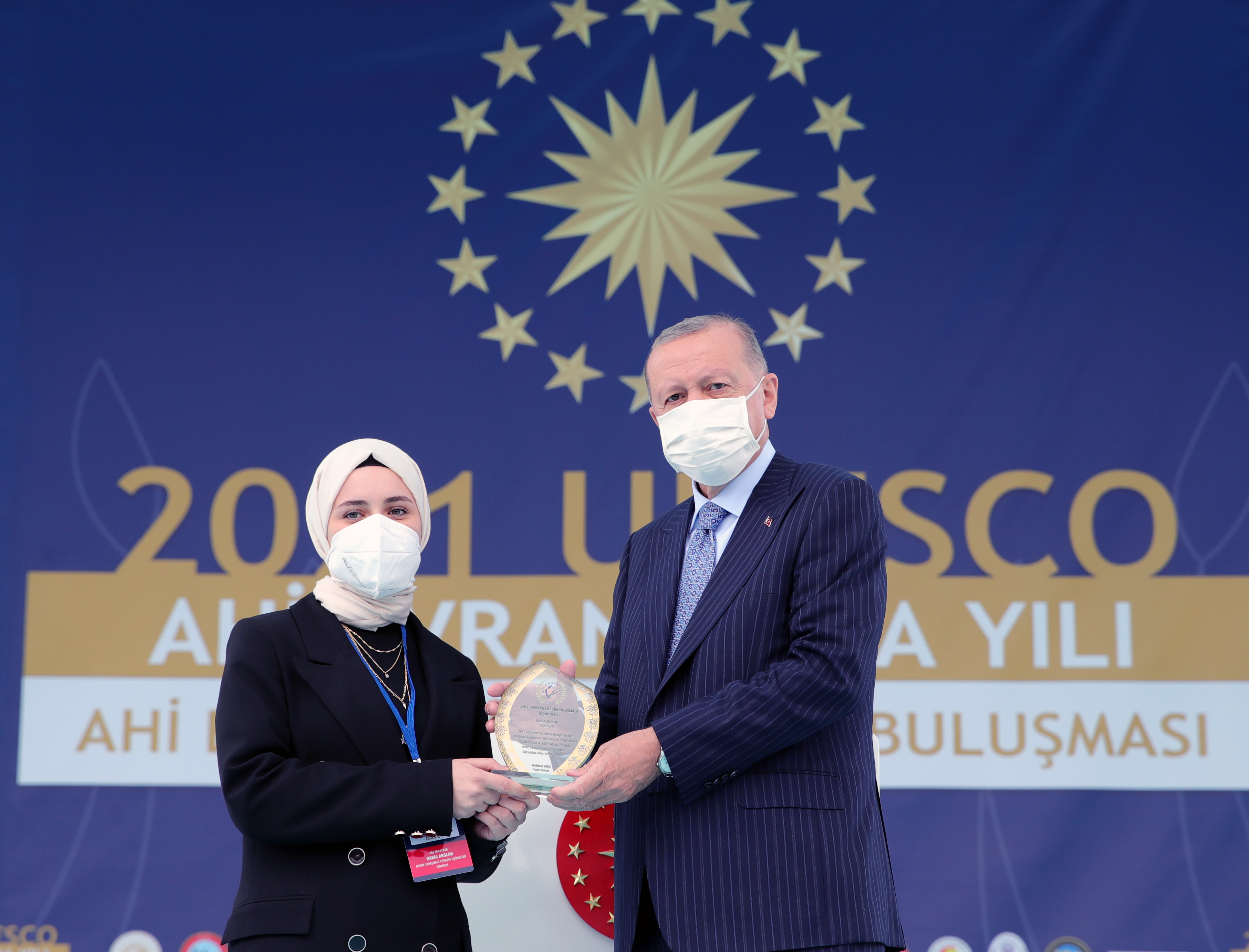 Ahilik Haftası çerçevesinde, lise öğrencileri arasında yapılan "Yardımlaşma ve Adil Paylaşım" konulu resim yarışmasında dereceye girenleri tebrik eden Cumhurbaşkanı Erdoğan, "Yine, yılın çırağı, kalfası ve ahisi ödülleriyle ahilik hizmet ödülünün takdim edileceği arkadaşlarımızı da tebrik ediyorum. Bizi, Ahilik Onur Ödülü'ne layık gören ahilerimize şükranlarımızı sunuyorum." dedi.