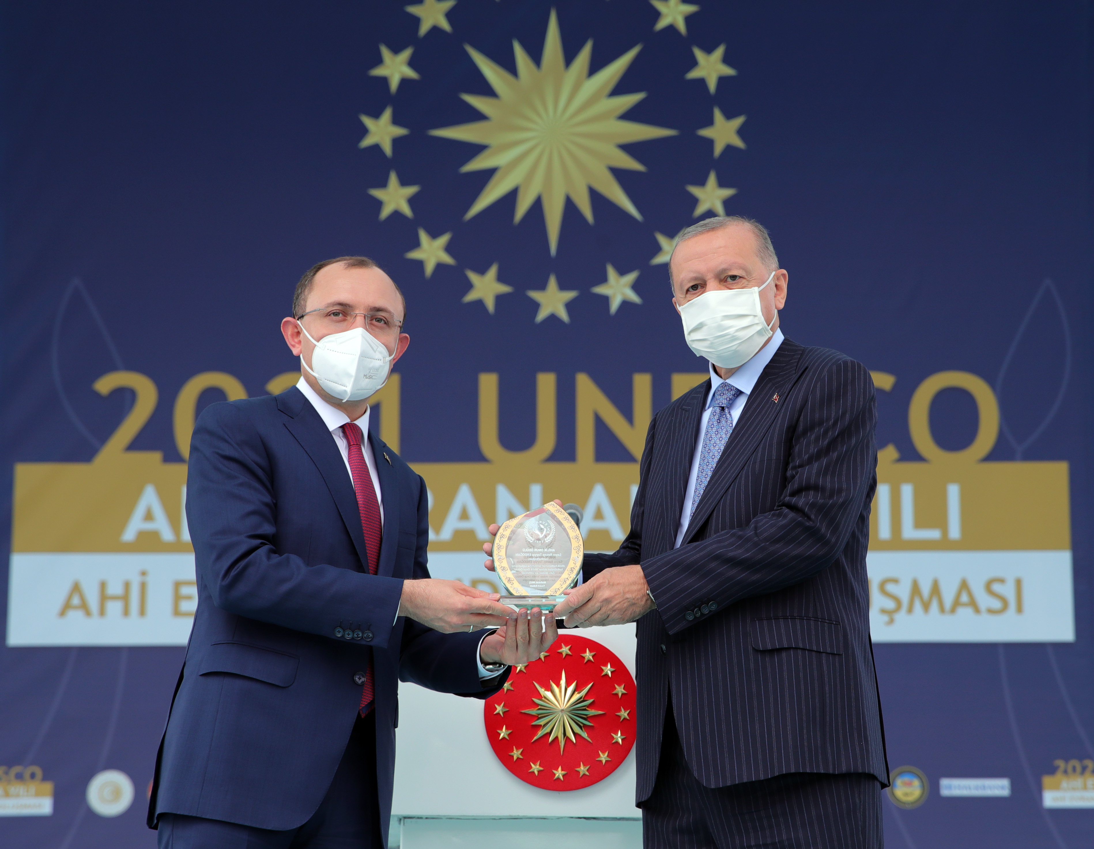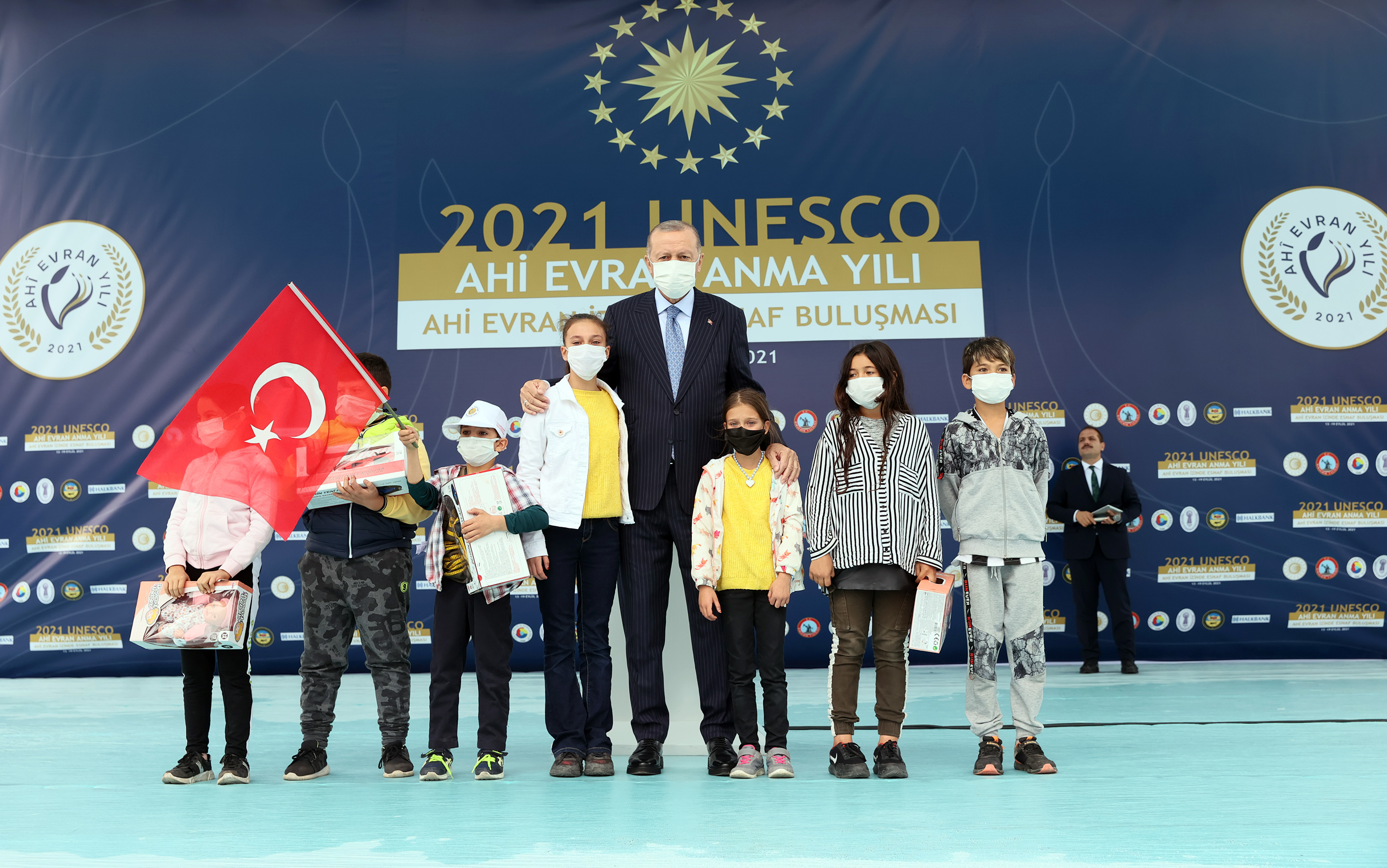 Ticaret Bakanı Mehmet Muş da Cumhurbaşkanı Erdoğan'a "Ahilik Onur Ödülü"nü takdim etti. Cumhurbaşkanı Erdoğan, ödül töreninin ardından oyuncak hediye ettiği çocuklarla sahnede fotoğraf çektirdi.