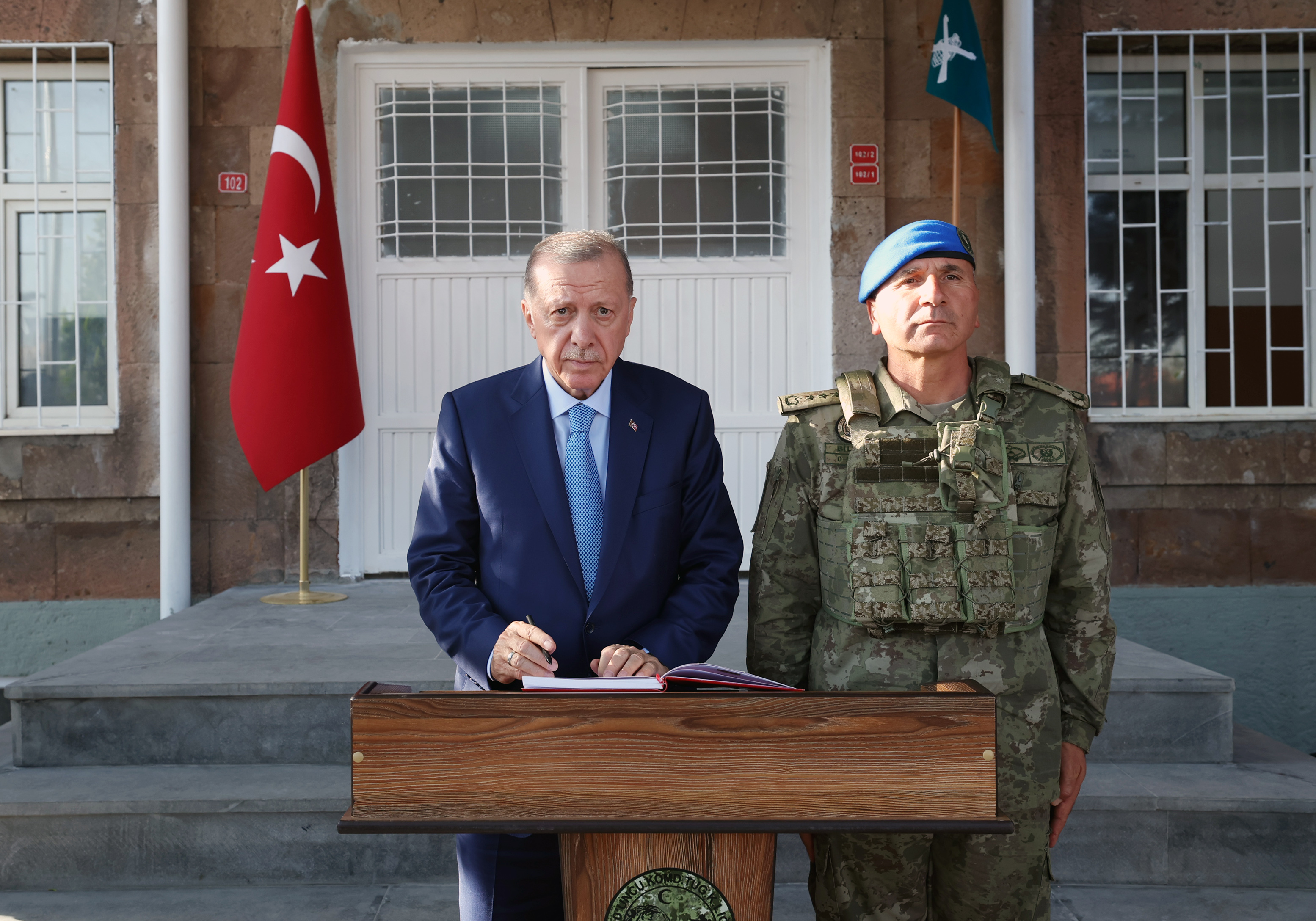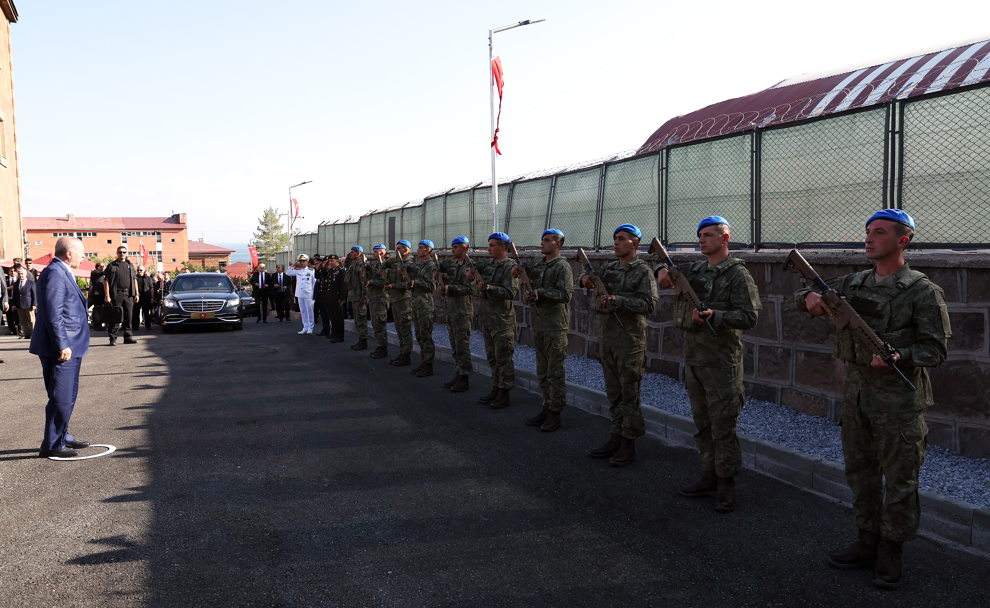Ahlat Komando Tabur Komutanlığı açılışına katılan Cumhurbaşkanı Recep Tayyip Erdoğan, tabur komutanlığına gelişinde tören mangasını selamladıktan sonra özel defteri imzaladı.