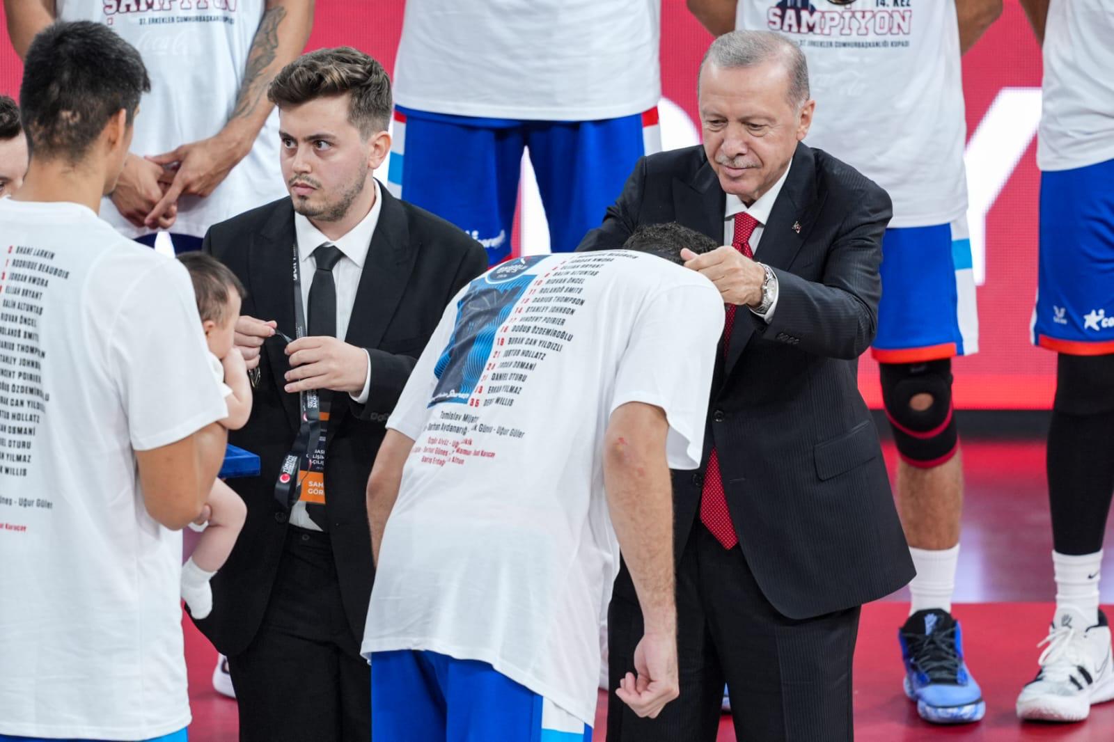 Sporculara madalyalarını takan Cumhurbaşkanı Erdoğan, kupayı Anadolu Efes takım kaptanı Shane Larkin'e takdim etti.