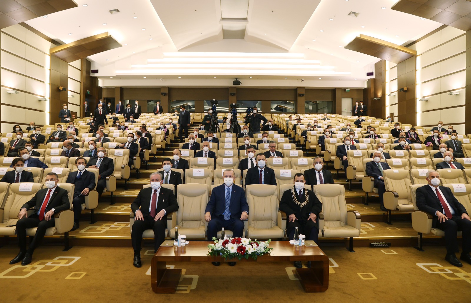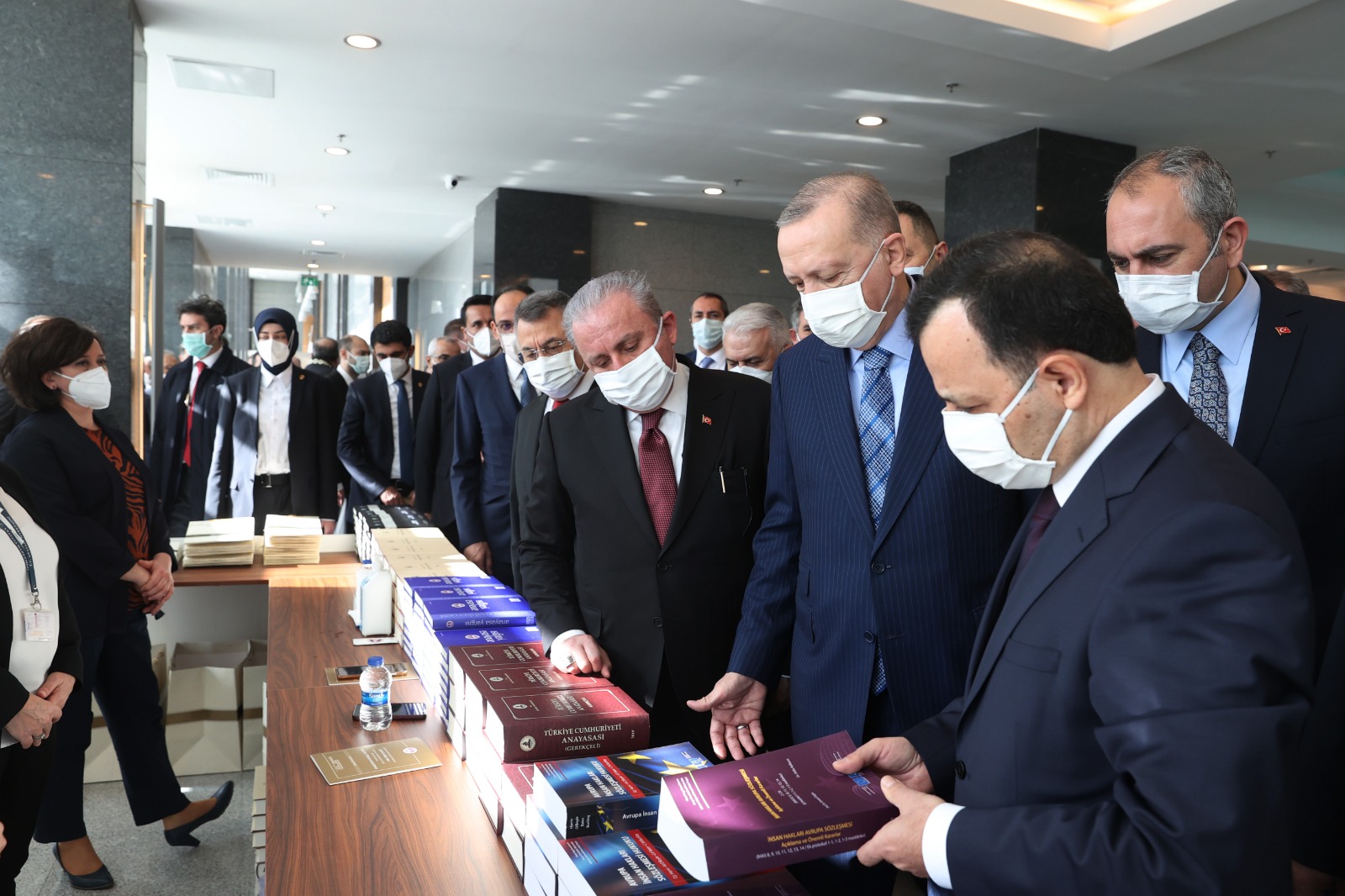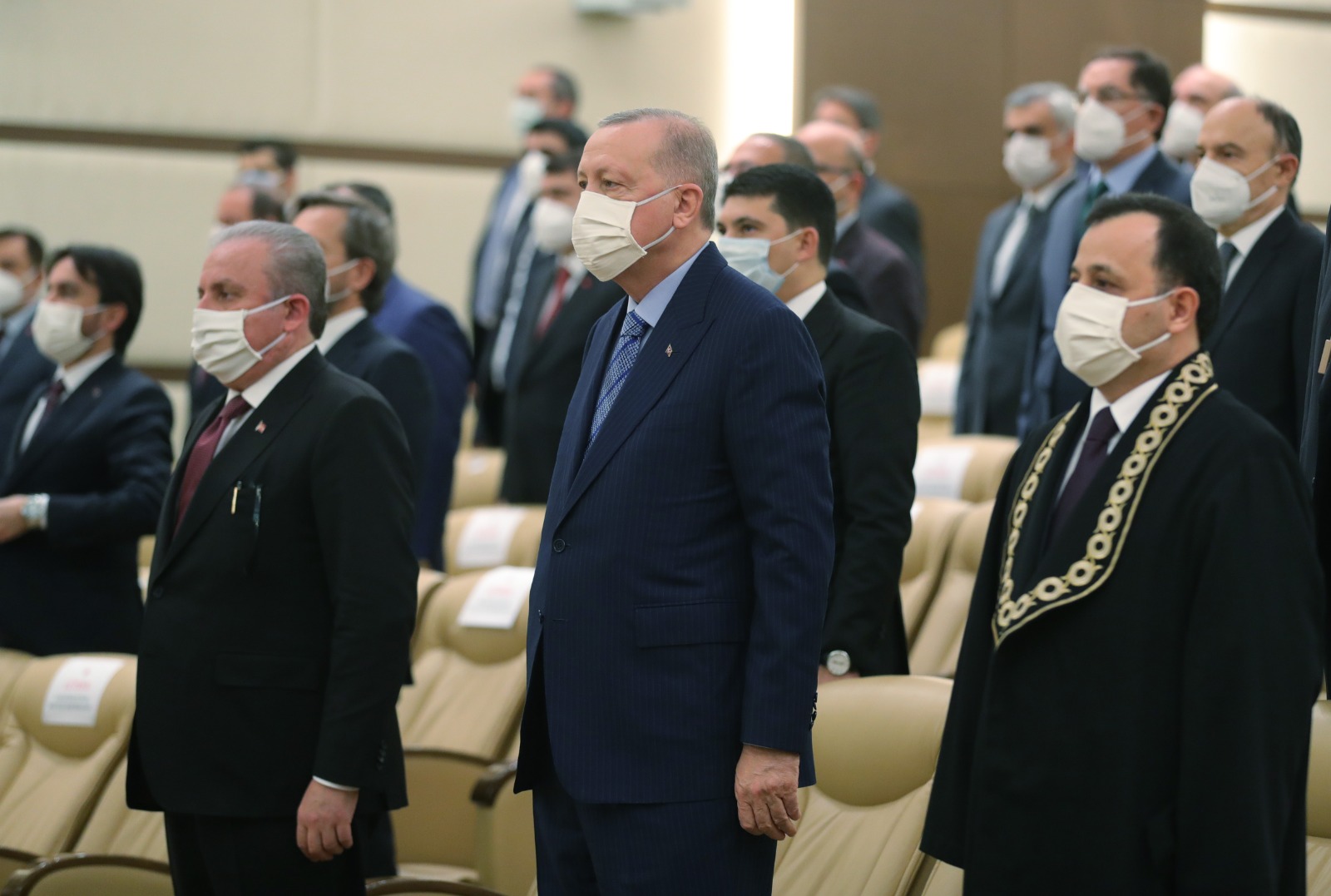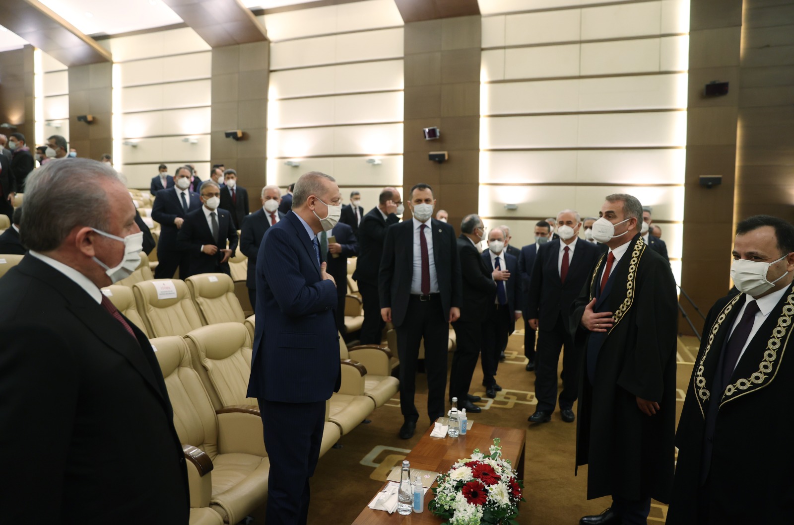 Törene gelişinde Anayasa Mahkemesi Başkanı Zühtü Arslan tarafından karşılanan Cumhurbaşkanı Erdoğan, daha sonra törenin düzenlendiği salona geçti.