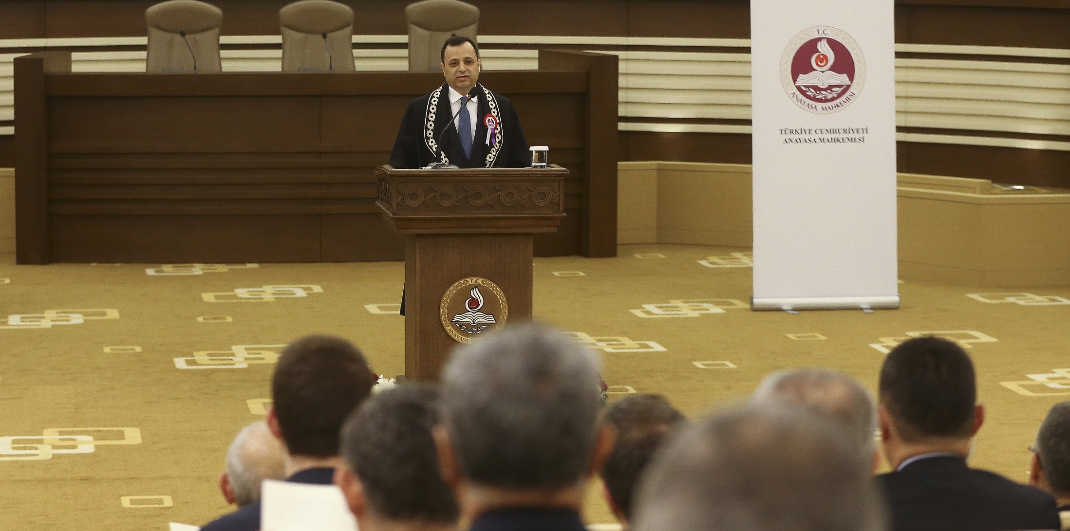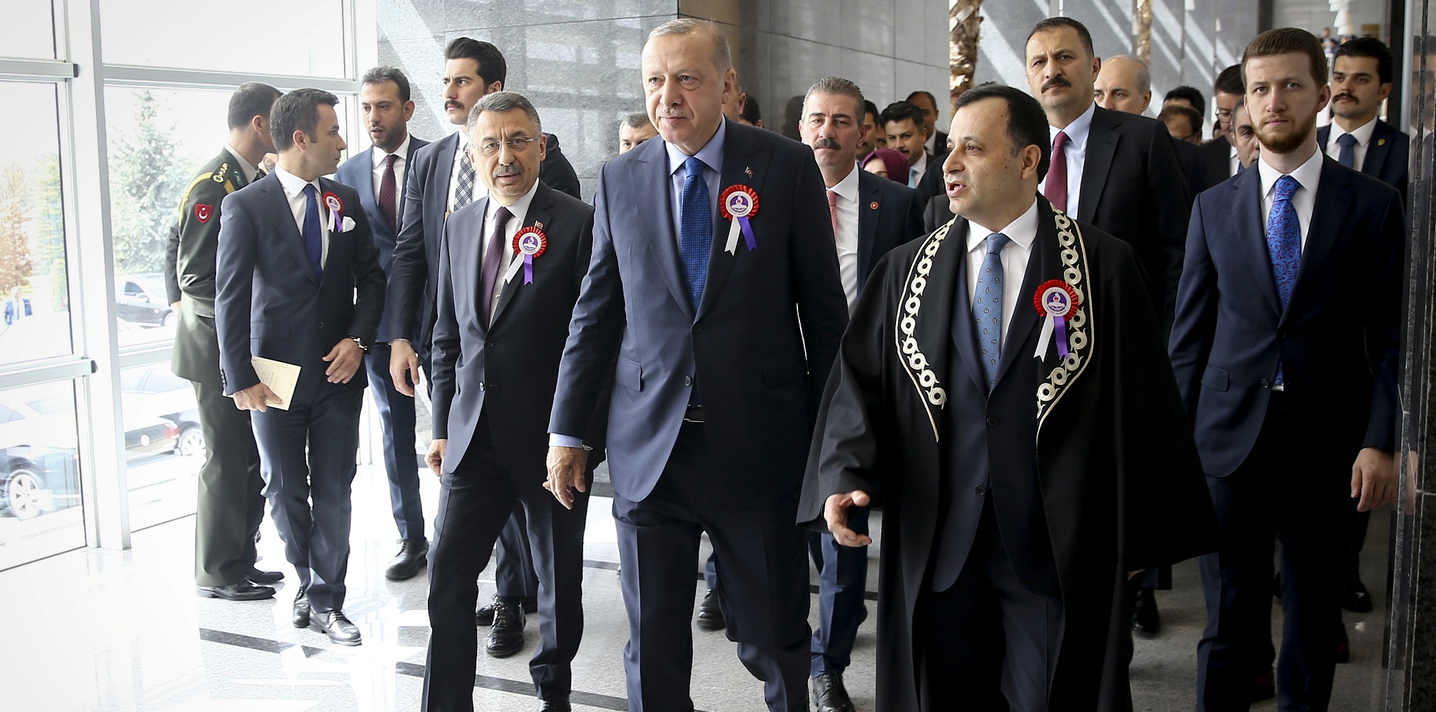 Anayasa Mahkemesi’ne gelişinde Anayasa Mahkemesi Başkanı Zühtü Arslan tarafından karşılanan Cumhurbaşkanı Erdoğan, daha sonra törenin gerçekleştirileceği Yüce Divan Salonu’na geçti.