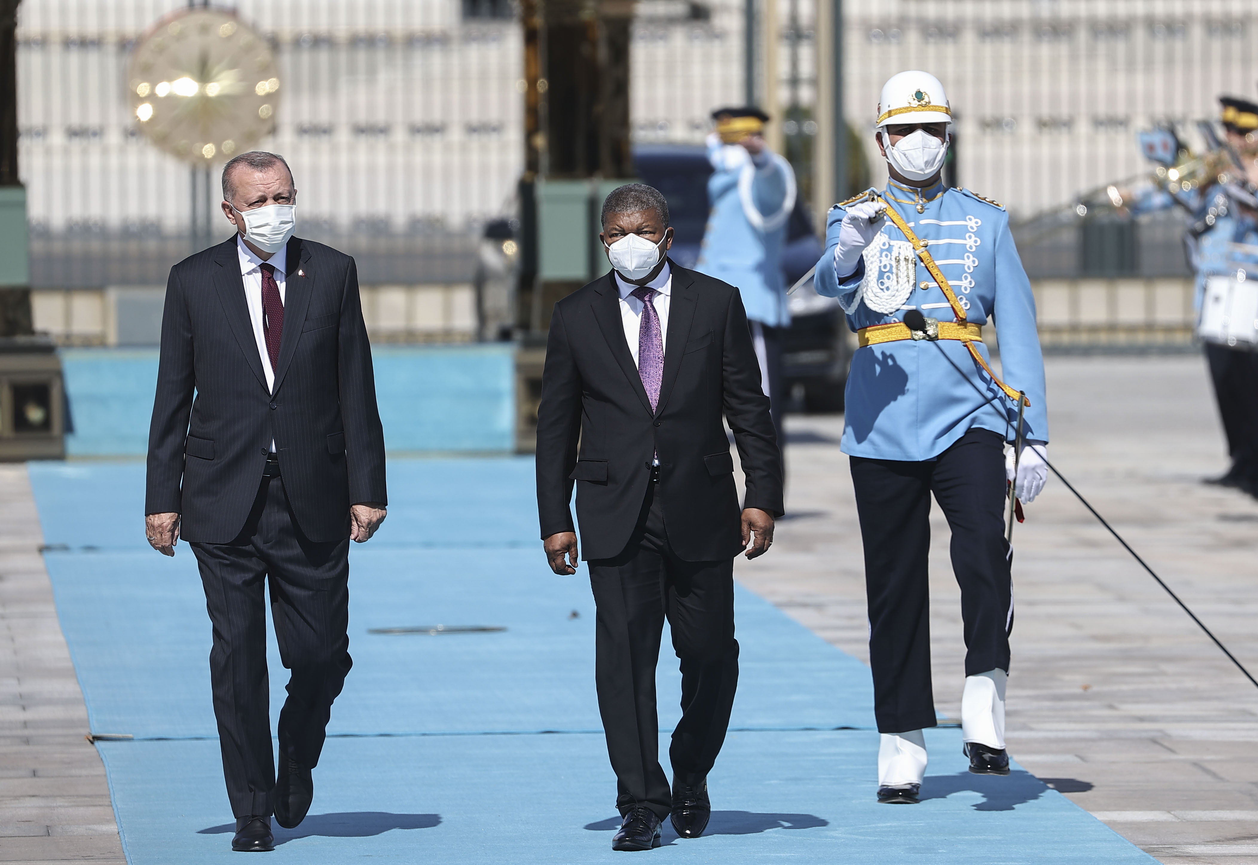 Cumhurbaşkanı Erdoğan, Angola Cumhurbaşkanı Lourenço'yu, Cumhurbaşkanlığı Külliyesi'nin ana giriş kapısında karşıladı. İki Cumhurbaşkanının tören alanındaki yerlerini almalarının ardından, 21 pare top atışı eşliğinde iki ülkenin milli marşları çalındı.