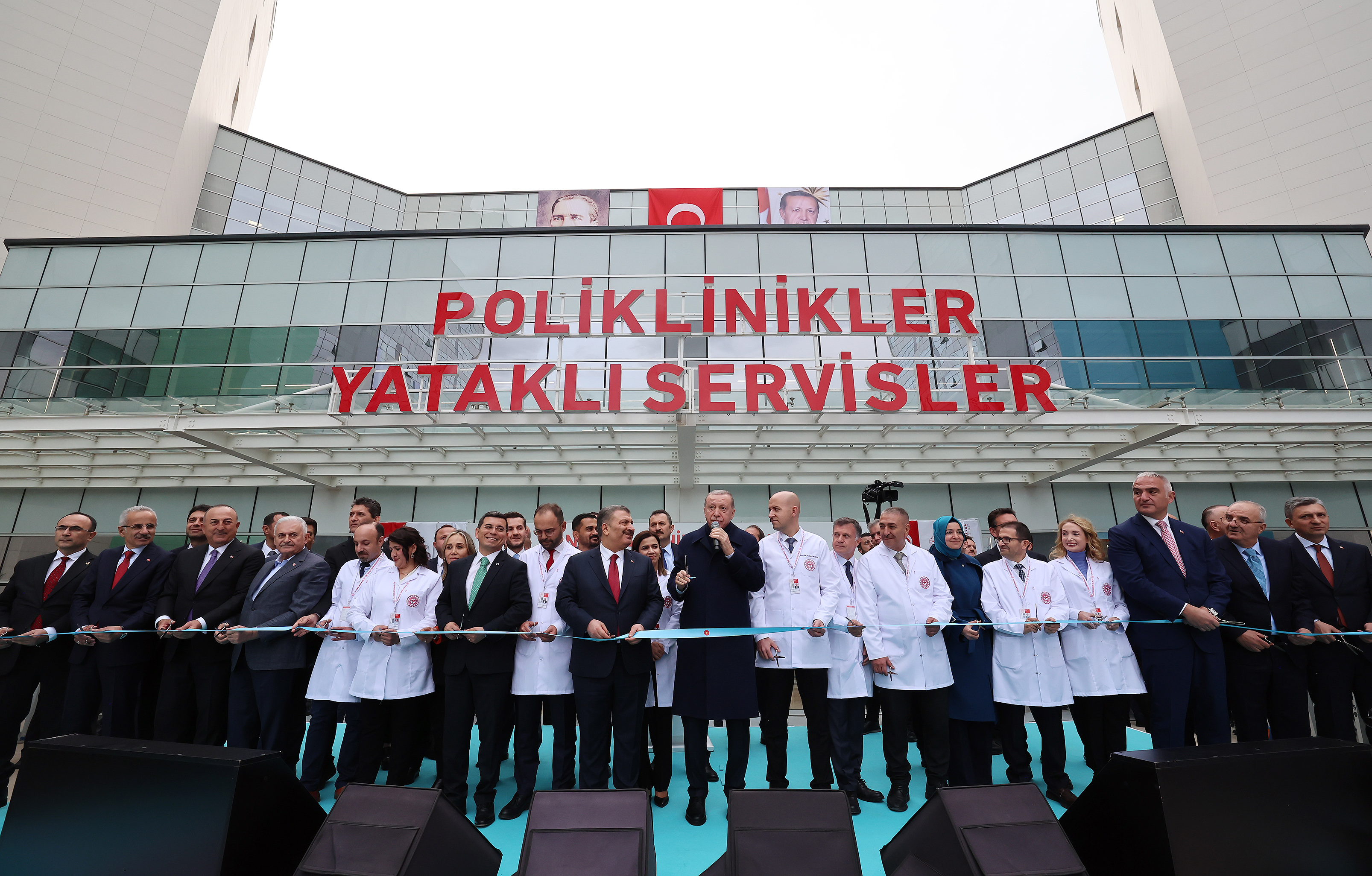 Cumhurbaşkanı Erdoğan, konuşmasının ardından beraberindeki heyet ve sağlık çalışanları ile birlikte Antalya Şehir Hastanesinin açılış kurdelesini kesti.