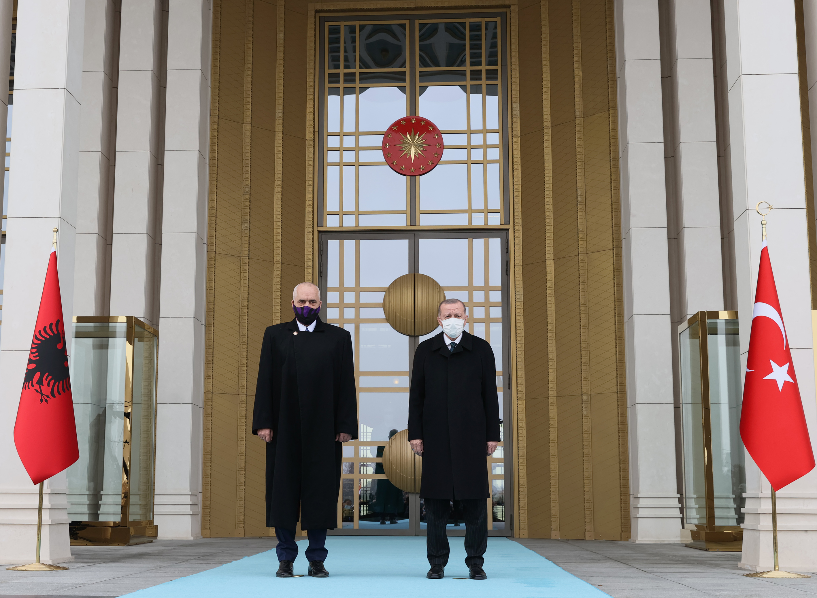 İki ülke heyetlerinin takdimi sonrasında Cumhurbaşkanı Erdoğan ve Arnavutluk Başbakanı Rama, merdivenlerde Türkiye ve Arnavutluk bayrakları önünde gazetecilere poz verdi.