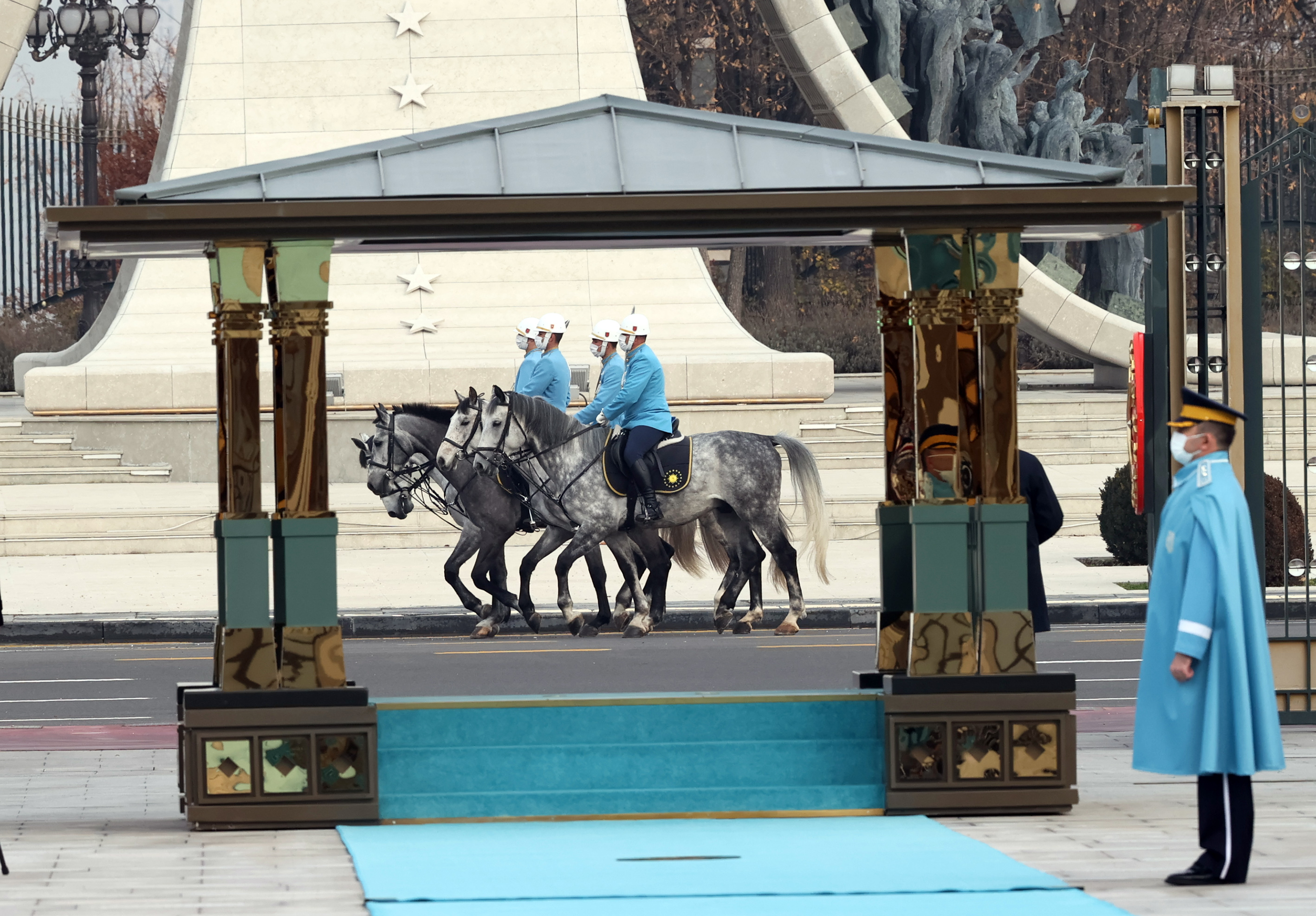 Arnavutluk Başbakanı Rama'nın bulunduğu makam aracını Cumhurbaşkanlığı Külliyesi'nin önündeki caddede karşılayan süvariler, protokol kapısına kadar eşlik etti.