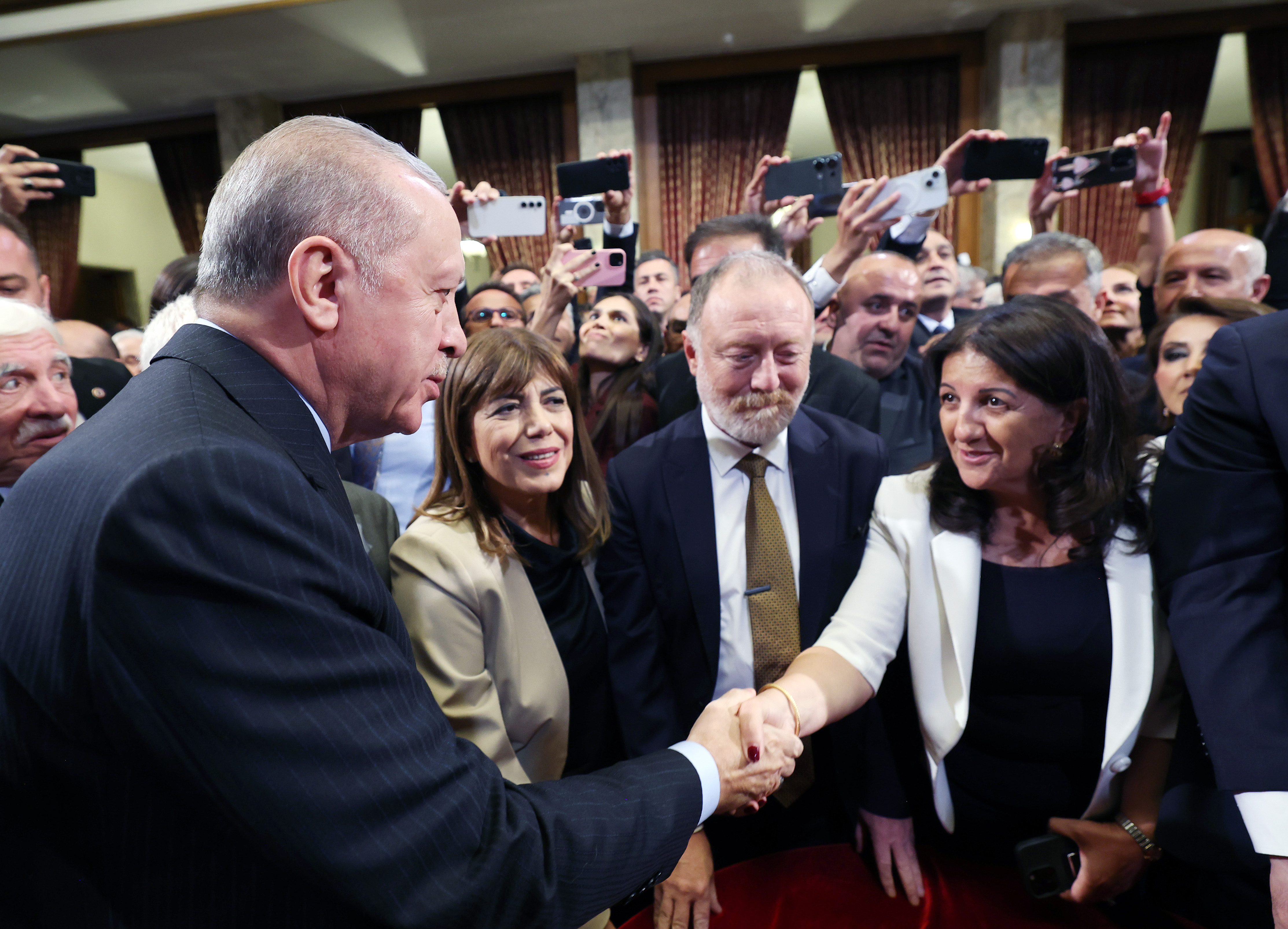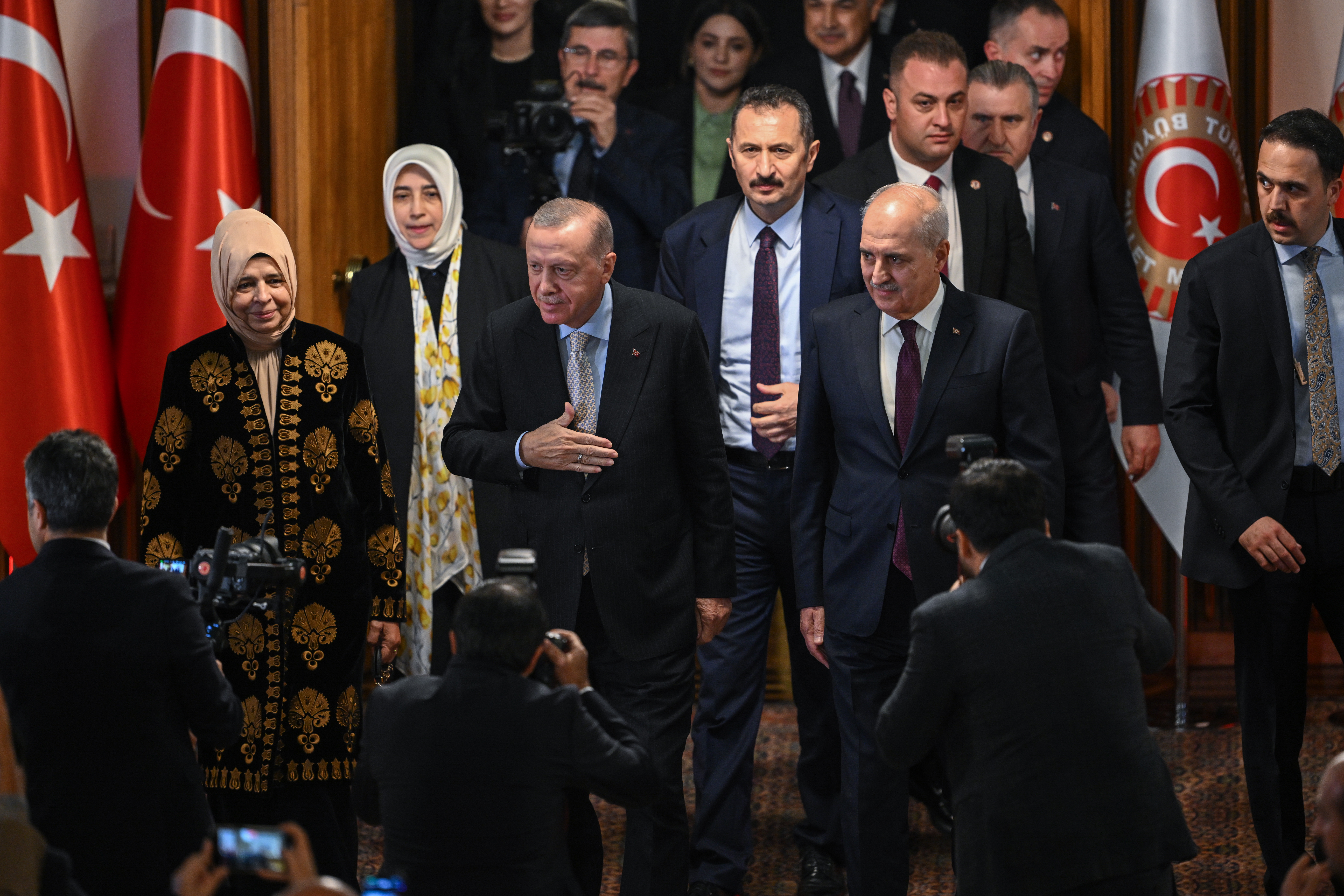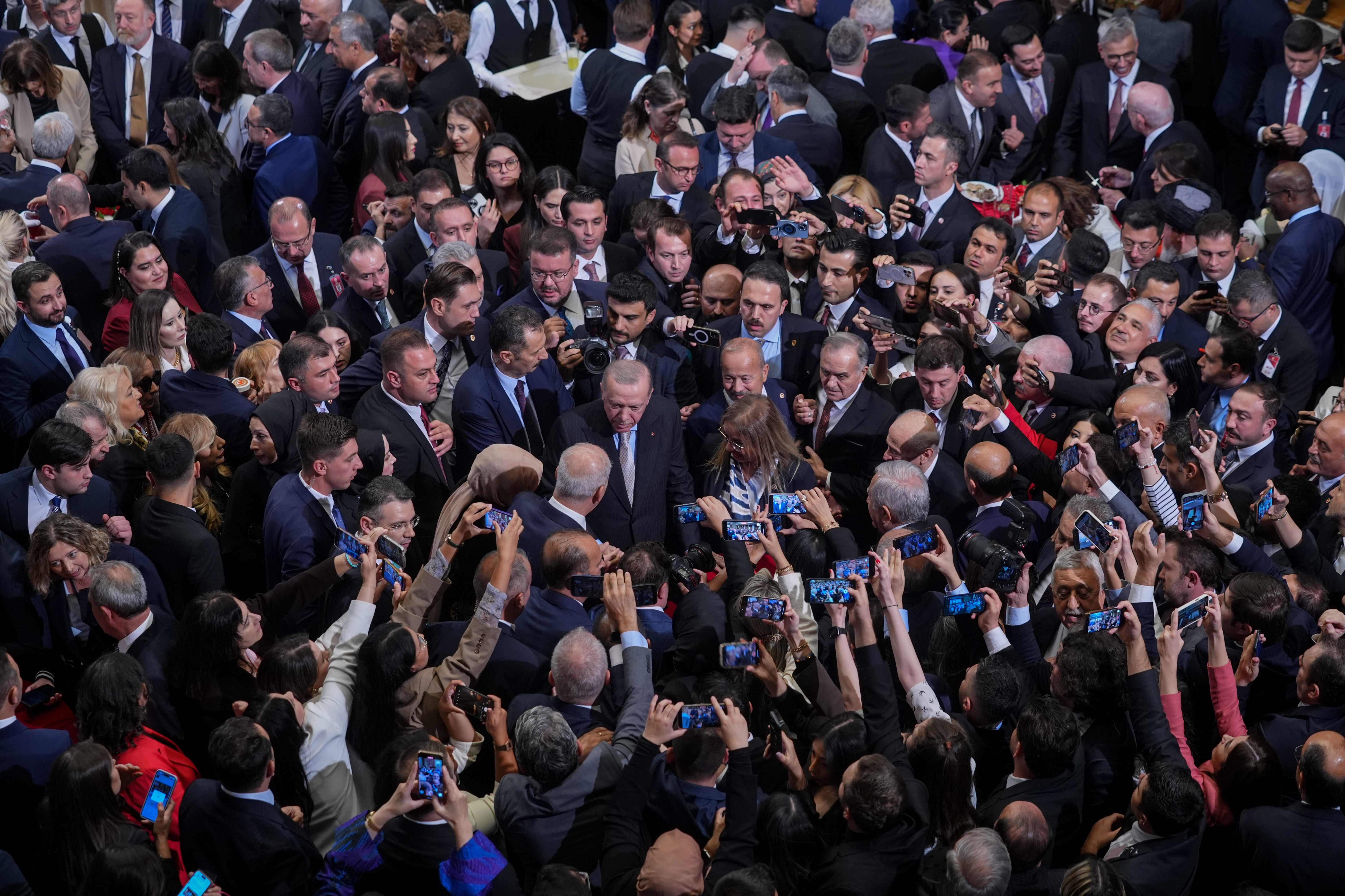 Cumhurbaşkanı Erdoğan, MHP Genel Başkanı Bahçeli'nin ve MHP'li milletvekillerinin bulunduğu, DEM Parti Eş Genel başkanları Bakırhan ve Hatimoğulları ile DEM Parti'li milletvekillerinin olduğu masaları ayrı ayrı ziyaret etti.